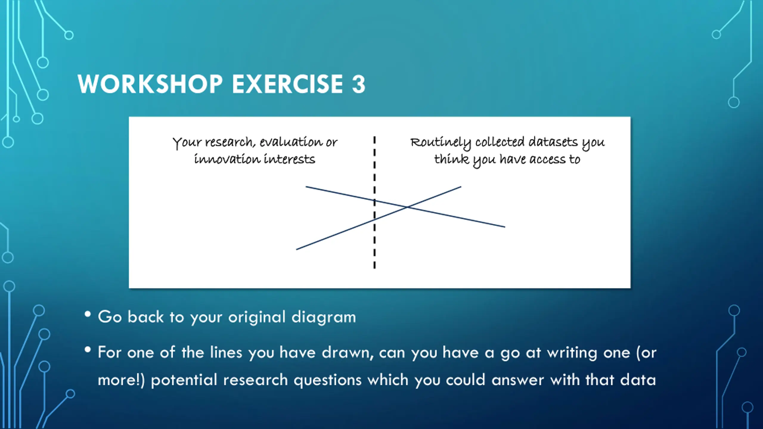 WORKSHOP EXERCISE 3 Your research, evaluation or Your research, evaluation or innovation interests innovation interests Routinely collected datasets you Routinely collected datasets you think you have access to think you have access to Go back to your original diagram For one of the lines you have drawn, can you have a go at writing one (or more!) potential research questions which you could answer with that data