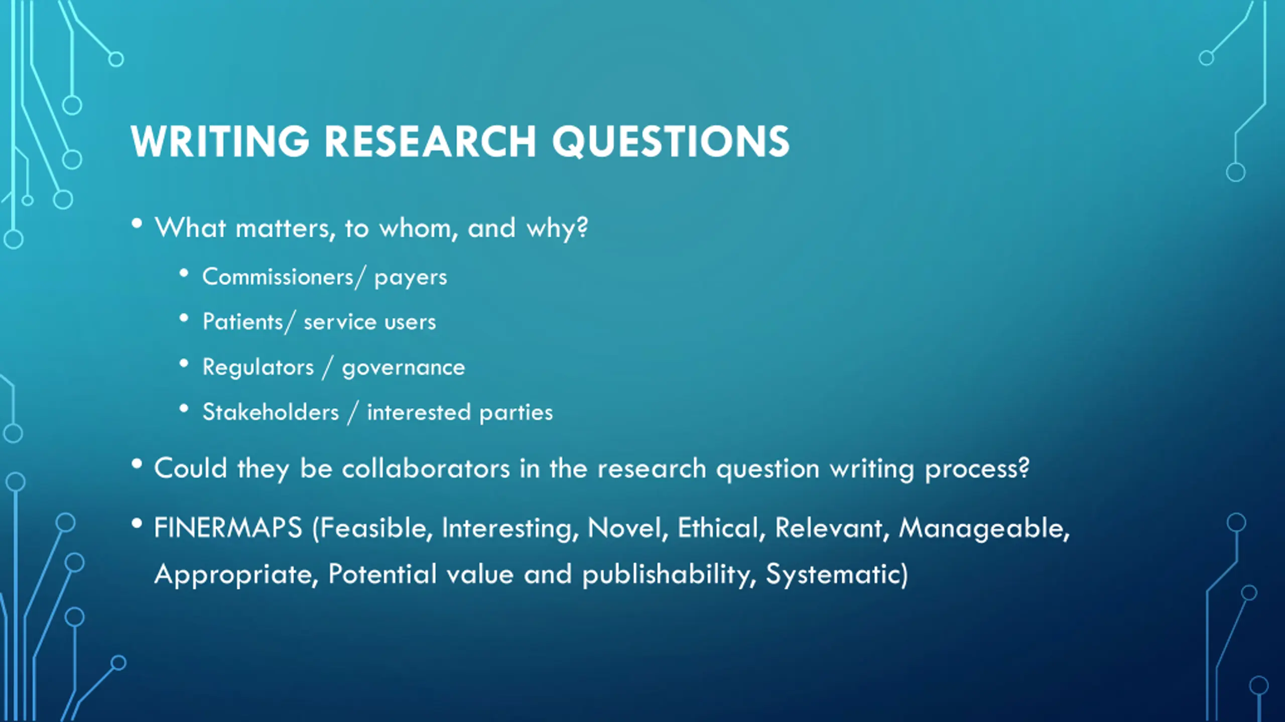 WRITING RESEARCH QUESTIONS What matters, to whom, and why? Commissioners/ payers Patients/ service users Regulators / governance Stakeholders / interested parties Could they be collaborators in the research question writing process? FINERMAPS (Feasible, Interesting, Novel, Ethical, Relevant, Manageable, Appropriate, Potential value and publishability, Systematic)