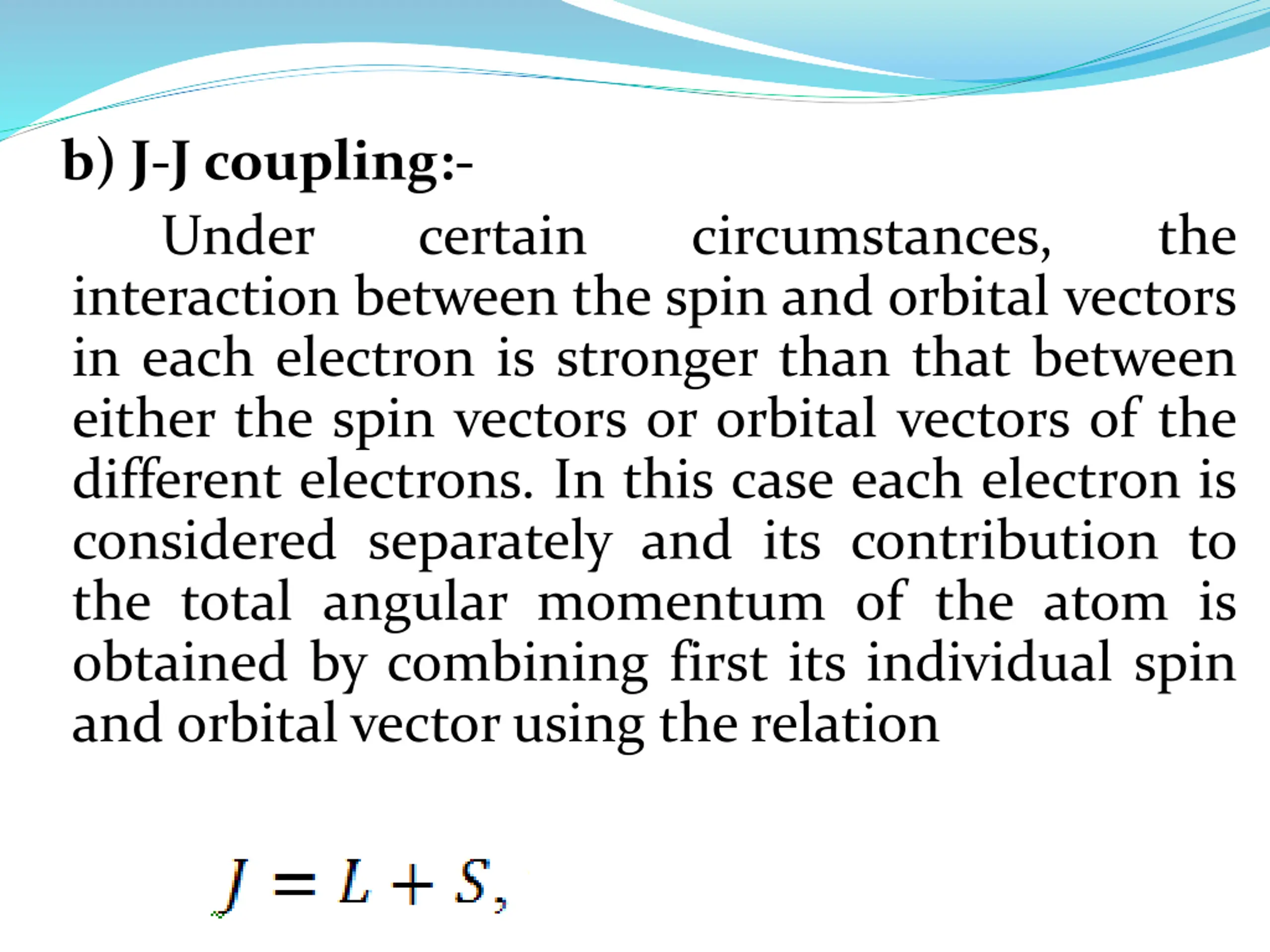 b) J-J coupling:- Under interaction between the spin and orbital vectors in each electron is stronger than that between either the spin vectors or orbital vectors of the different electrons. In this case each electron is considered separately and its contribution to the total angular momentum of the atom is obtained by combining first its individual spin and orbital vectorusing the relation certain circumstances, the