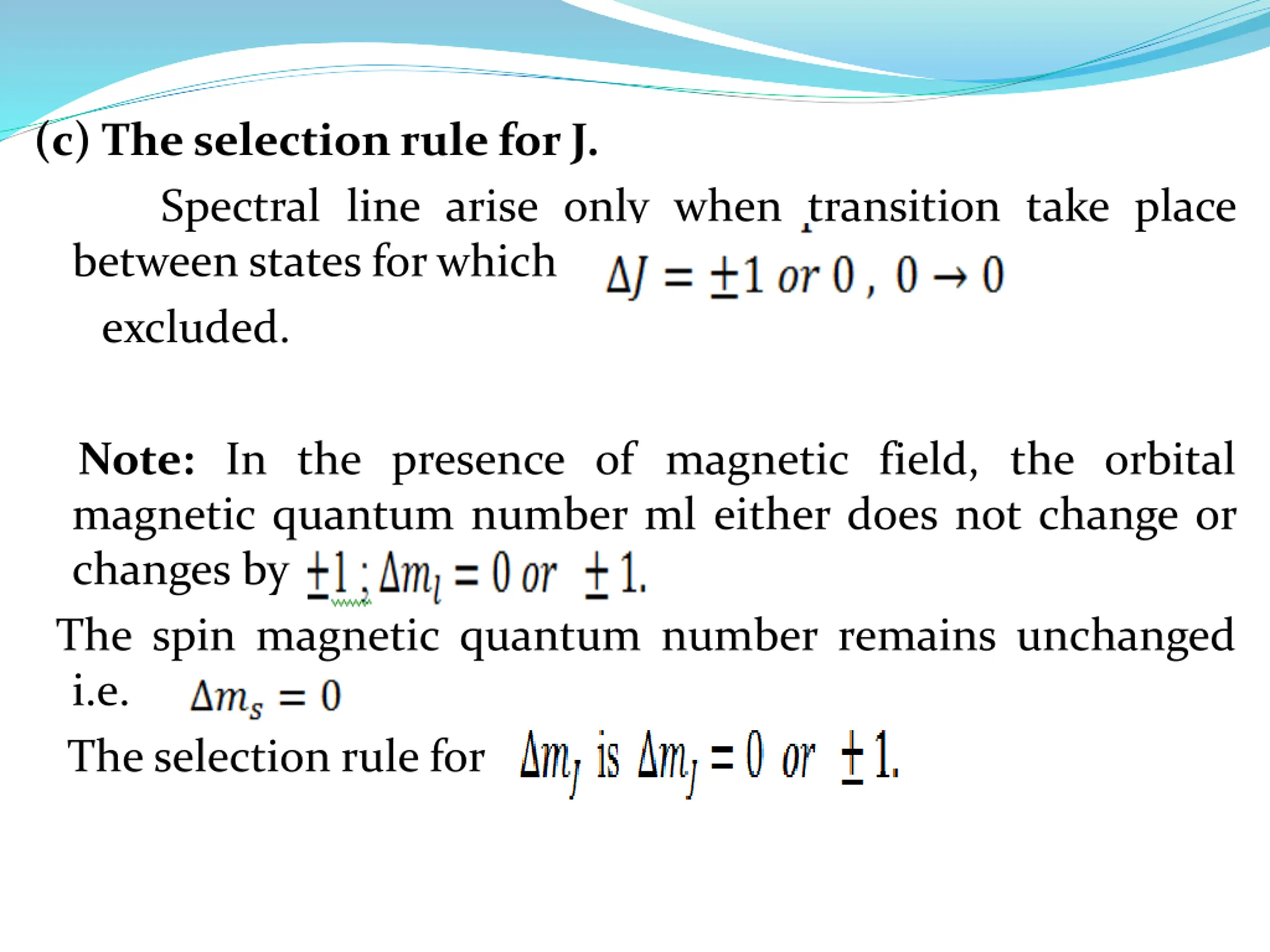 (c) The selection rule for J. Spectral line arise only when transition take place between states forwhich excluded. Note: In the presence of magnetic field, the orbital magnetic quantum number ml either does not change or changes by The spin magnetic quantum number remains unchanged i.e. The selection rule for