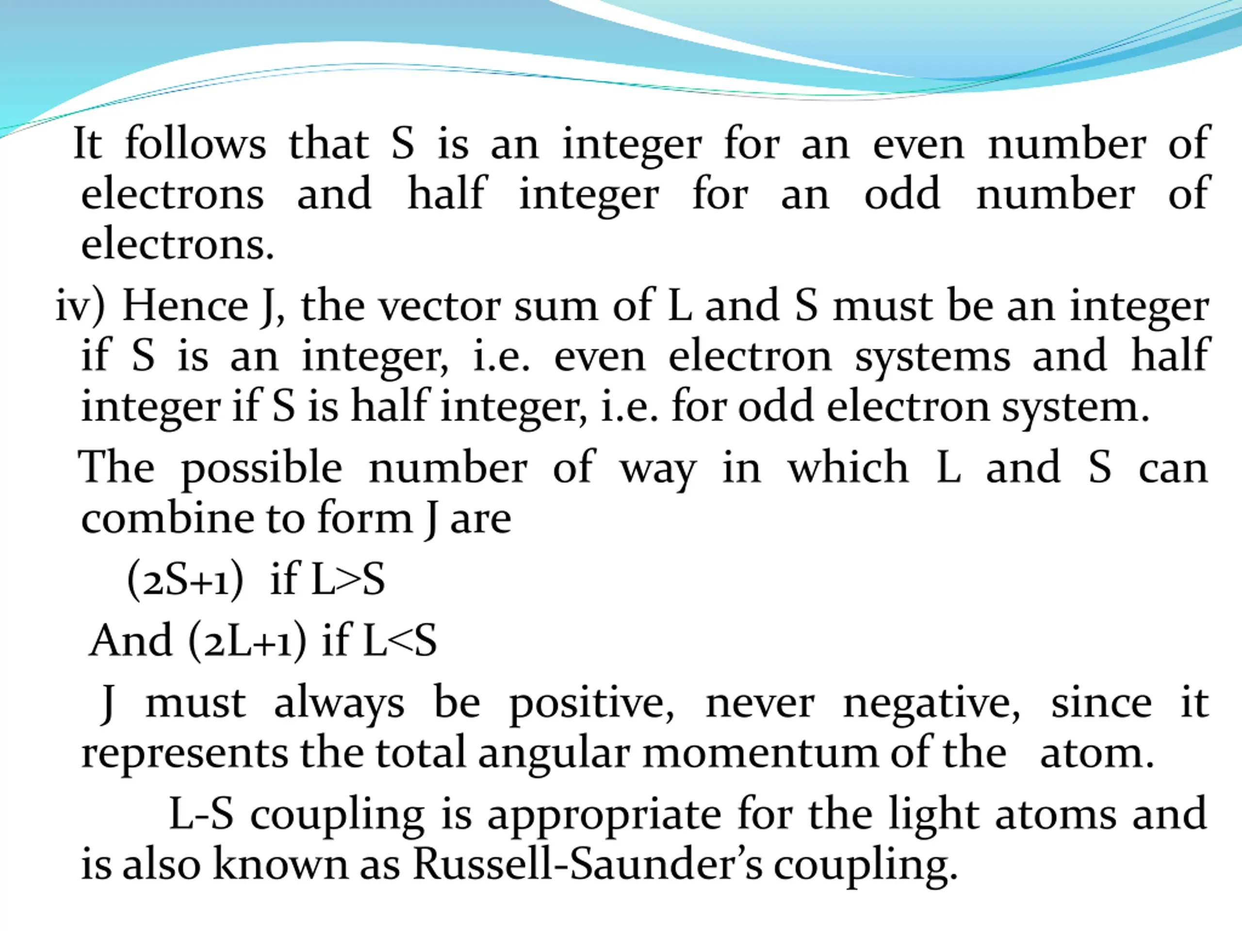 It follows that S is an integer for an even number of electrons and half integer for an odd number of electrons. iv) Hence J, the vector sum of L and S must be an integer if S is an integer, i.e. even electron systems and half integer if S is half integer, i.e. forodd electron system. The possible number of way in which L and S can combine to form J are (2S+1) if L S And (2L+1) if L S J must always be positive, never negative, since it represents the total angular momentum of the atom. L-S coupling is appropriate for the light atoms and is also known as Russell-Saunder s coupling.