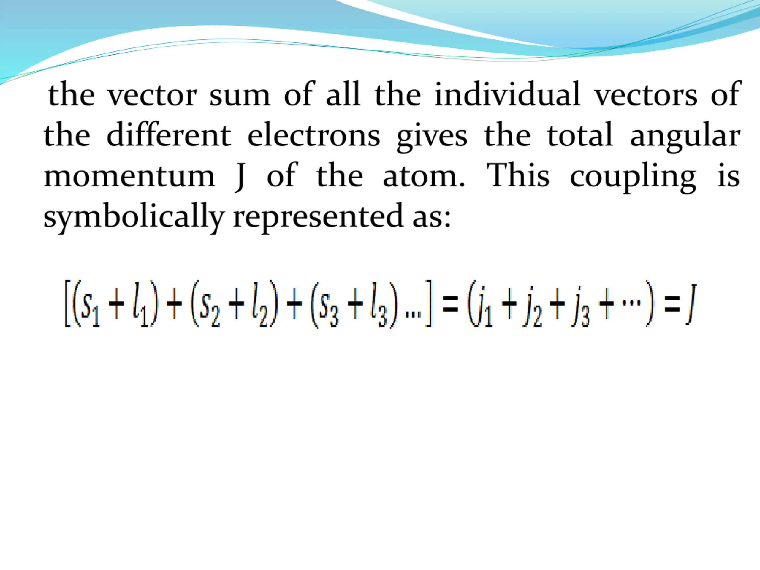 the vector sum of all the individual vectors of the different electrons gives the total angular momentum J of the atom. This coupling is symbolically represented as: