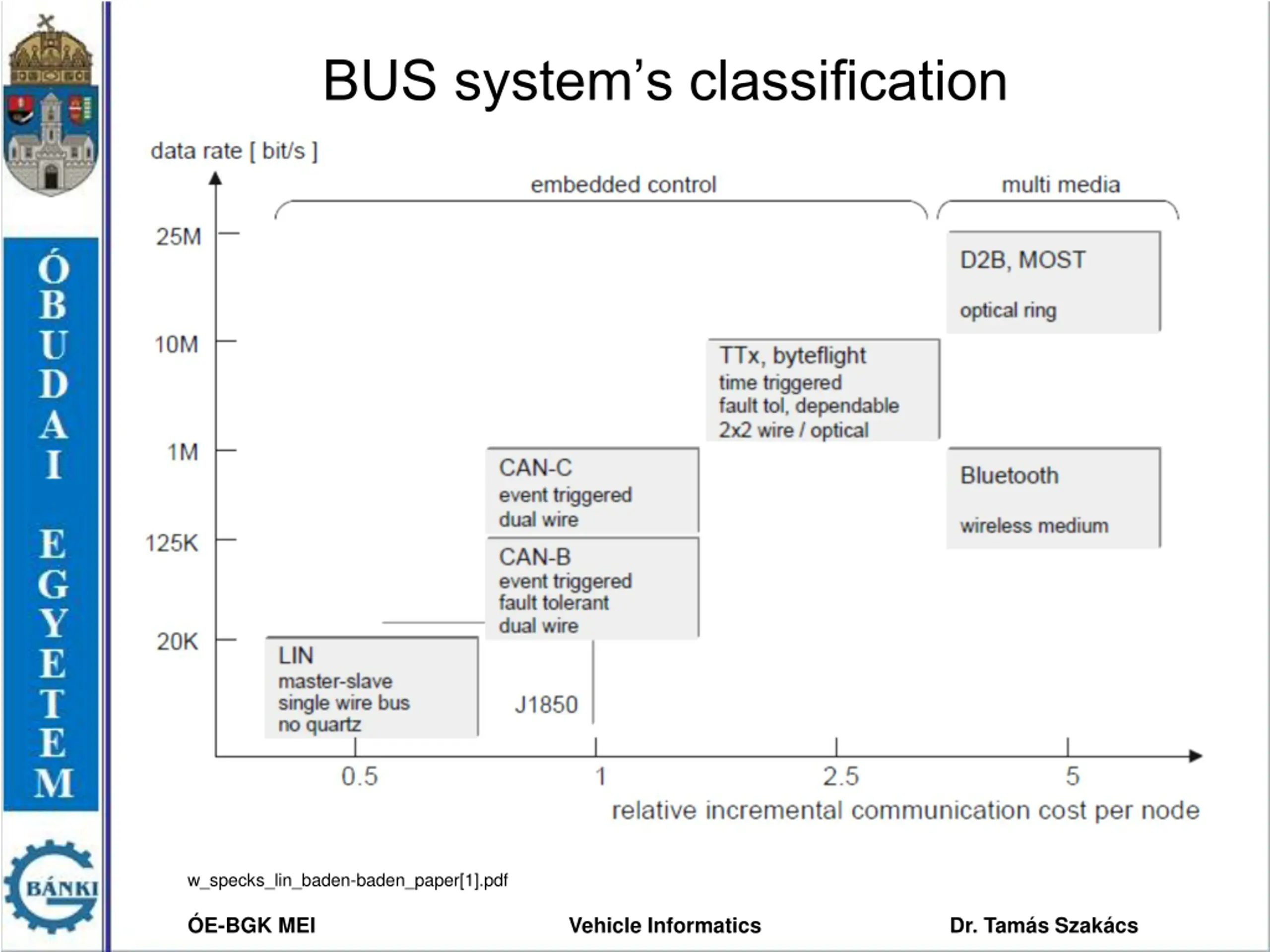 BUS systems classification The applications for network protocols in vehicles can be separated in four distinct areas. There is no single protocol, which could claim to represent a one fits all solution for all these areas. Each of them requires specific protocol features: Multimedia applications, calling for protocols providing high speed, high bandwidth, and even wireless interconnection, like MOST, D2B, or Bluetooth; Emerging safety critical applications in chassis and power train (x- by wire) calling for a fault tolerant, dependable protocol, like TTP/C, Byteflight, TT-CAN or others; Conventional body and powertrain applications, mainly using CAN; Mechatronic type applications such as smart sensors and actuator, or even complex ECUs with simple communications needs, being addressed by low-end protocols like LIN, TTP/A, J-1850, and quite a few other OEM or Tier-I in-house protocols. w_specks_lin_baden-baden_paper[1].pdf E-BGK MEI Vehicle Informatics Dr. Tam s Szak cs