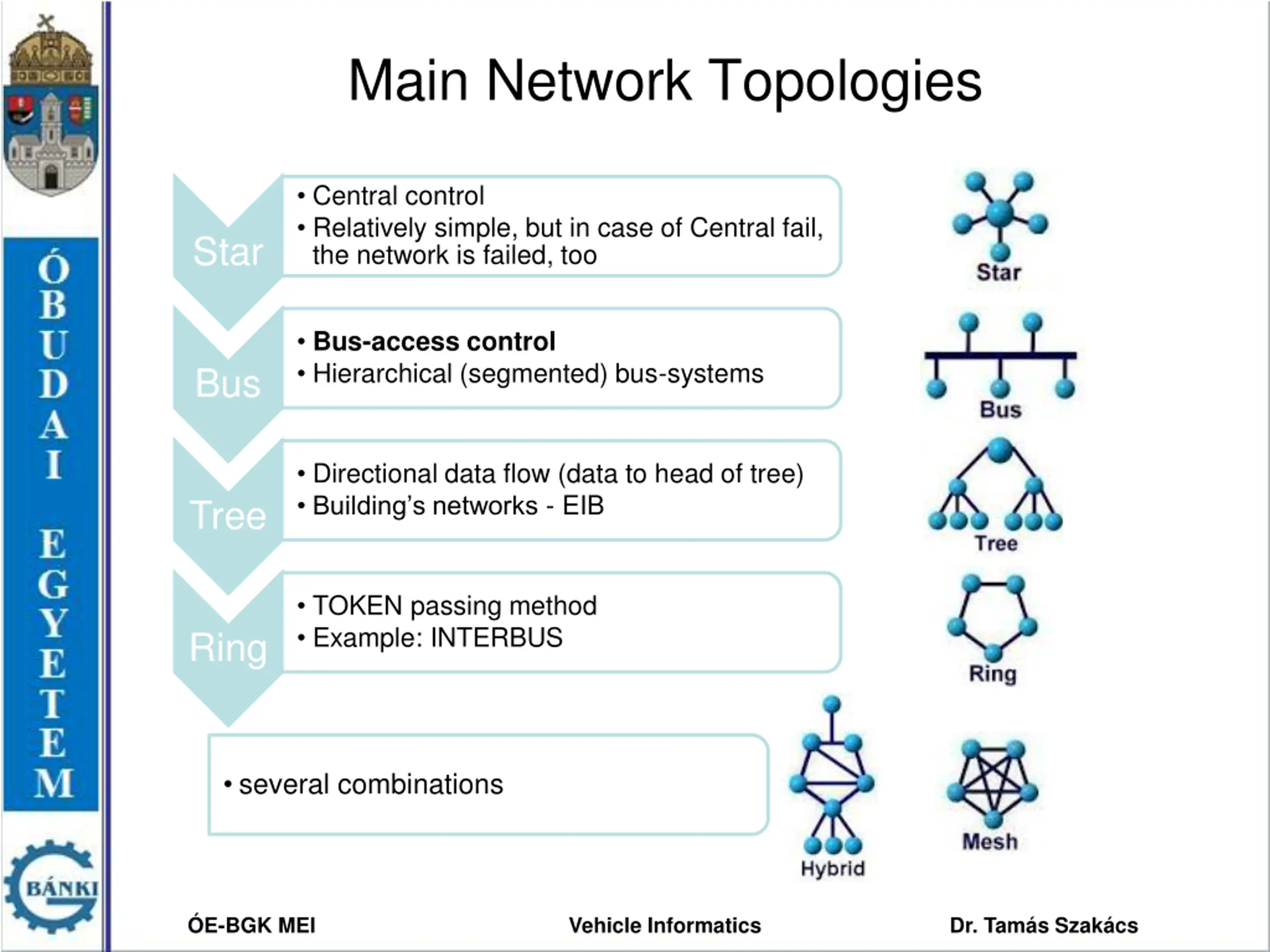 Main Network Topologies Central control Relatively simple, but in case of Central fail, the network is failed, too Star Bus-access control Hierarchical (segmented) bus-systems Bus Directional data flow (data to head of tree) Building s networks - EIB Tree TOKEN passing method Example: INTERBUS Ring several combinations E-BGK MEI Vehicle Informatics Dr. Tam s Szak cs
