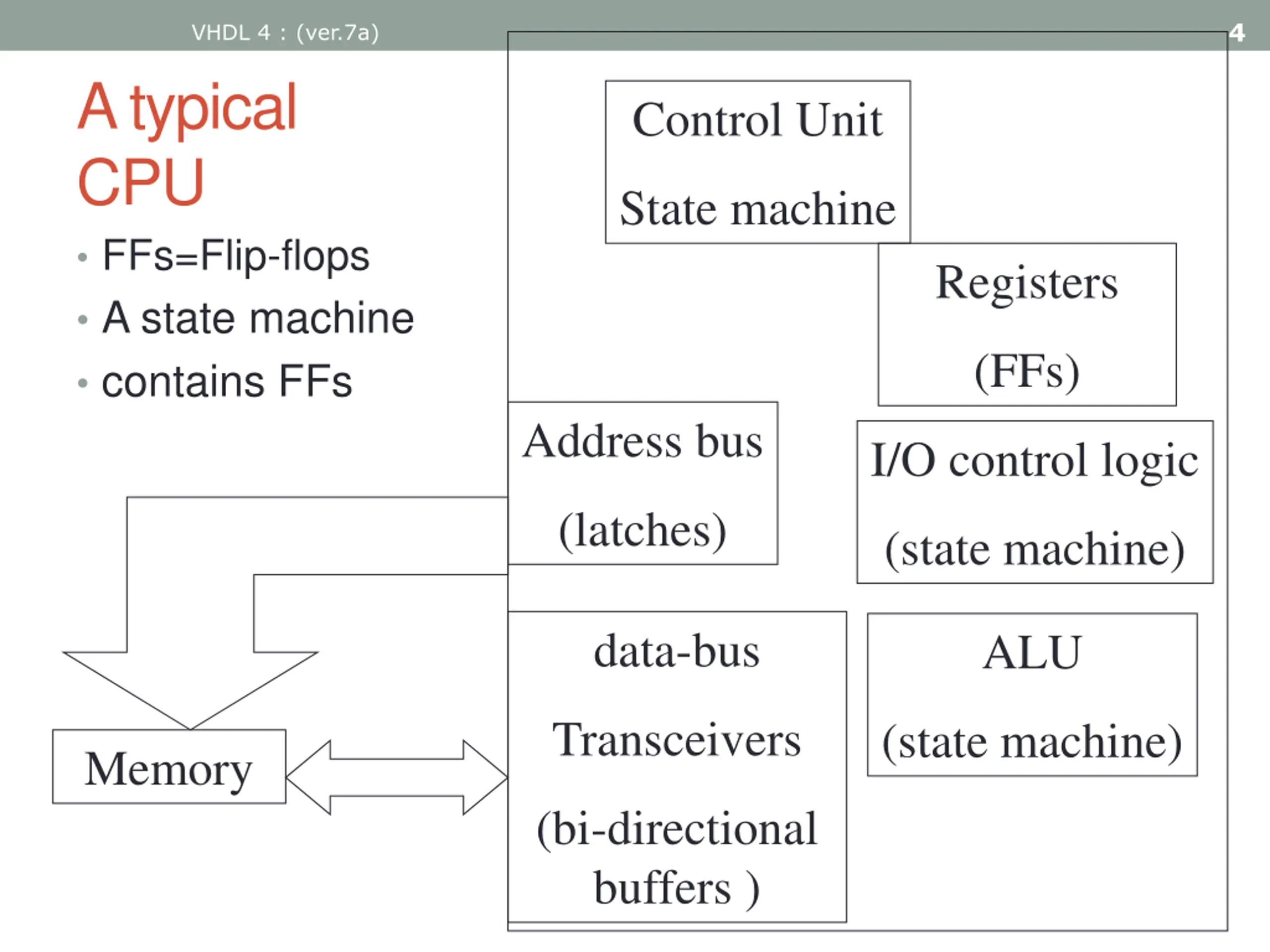 4 VHDL 4 : (ver.7a) A typical CPU FFs=Flip-flops A state machine contains FFs Control Unit State machine Registers (FFs) Address bus I/O control logic (latches) (state machine) data-bus ALU Transceivers (state machine) Memory (bi-directional buffers )