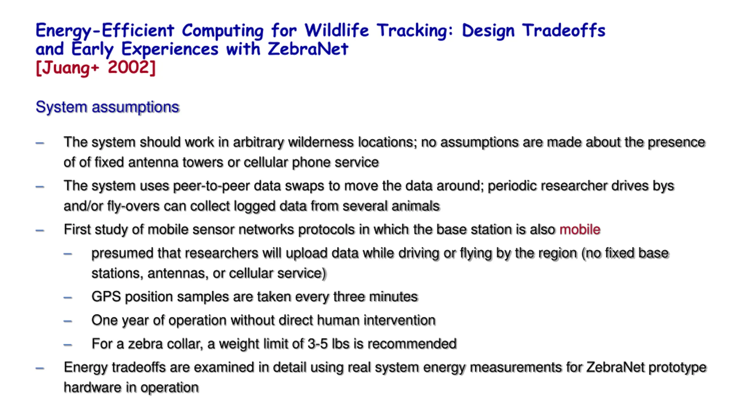 Energy-Efficient Computing for Wildlife Tracking: Design Tradeoffs and Early Experiences with ZebraNet [Juang+ 2002] Drawbacks of the previous techniques: Many studies rely on collaring a sample subset of animals with simple VHF transmitters Periodically drive through and/or fly over an area with a receiver antenna, and listen for pings from previously collared animals. Once animal is found, its behavior can be observed and its observed position can be logged; however, there are limits to such studies data collection is infrequent and can miss many interesting events o mostly limited to daylight hours, but animal behavior and movements in night hours can be different o data collection is impossible or very limited for secluded species that avoid human contact o The most elegant trackers commercially available use GPS to track position and use satellite uploads to transfer data to a base station and these systems also suffer from several limitations at most a log of 3000 position samples can be logged and no biometric data o satellite uploads/downloads are slow, expensive and high power consumption: done infrequently o operate on batteries without recharge o
