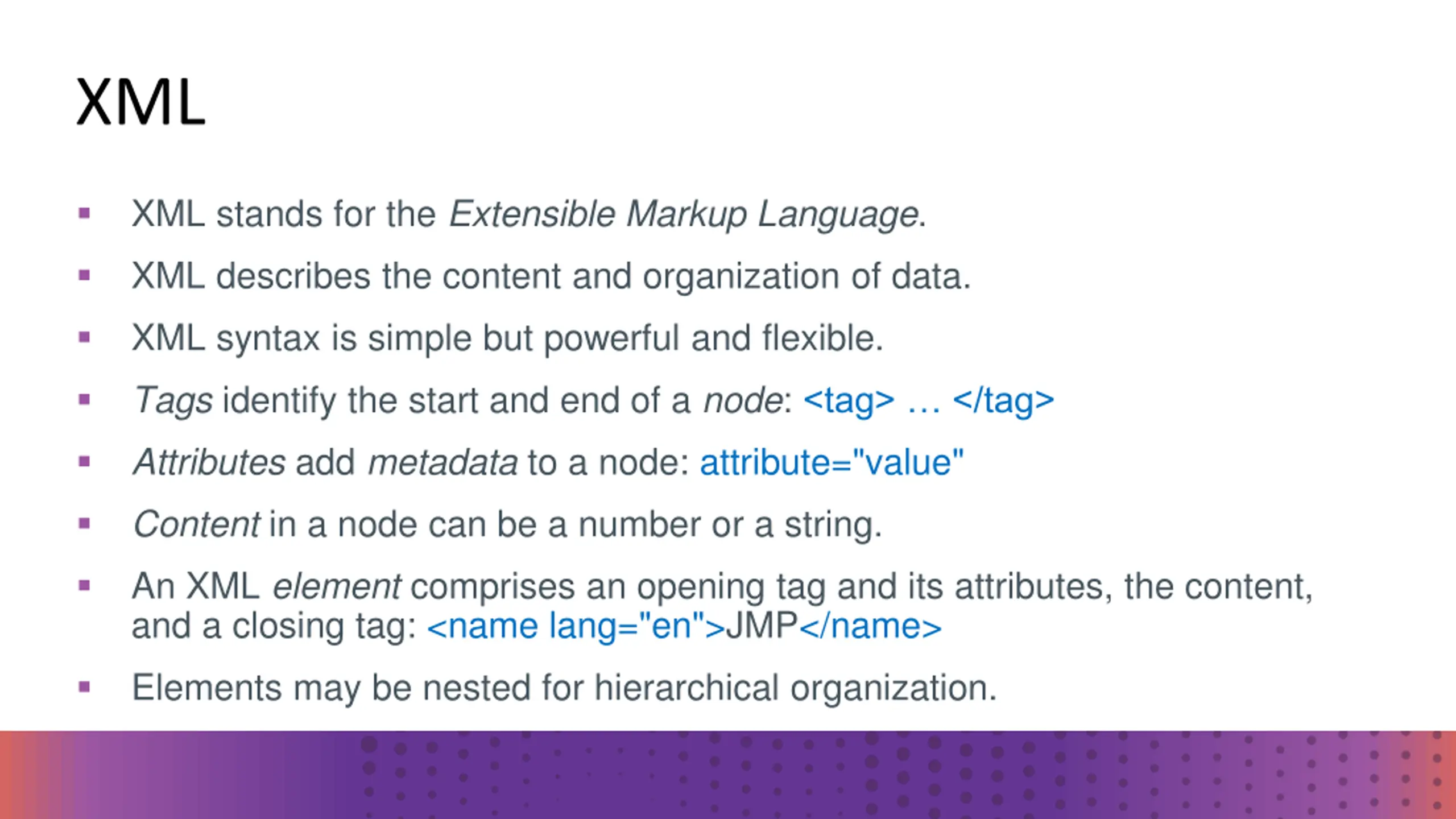 XML XML stands for the Extensible Markup Language. XML describes the content and organization of data. XML syntax is simple but powerful and flexible. Tags identify the start and end of a node: <tag> </tag> Attributes add metadata to a node: attribute="value" Content in a node can be a number or a string. An XML element comprises an opening tag and its attributes, the content, and a closing tag: <name lang="en">JMP</name> Elements may be nested for hierarchical organization.