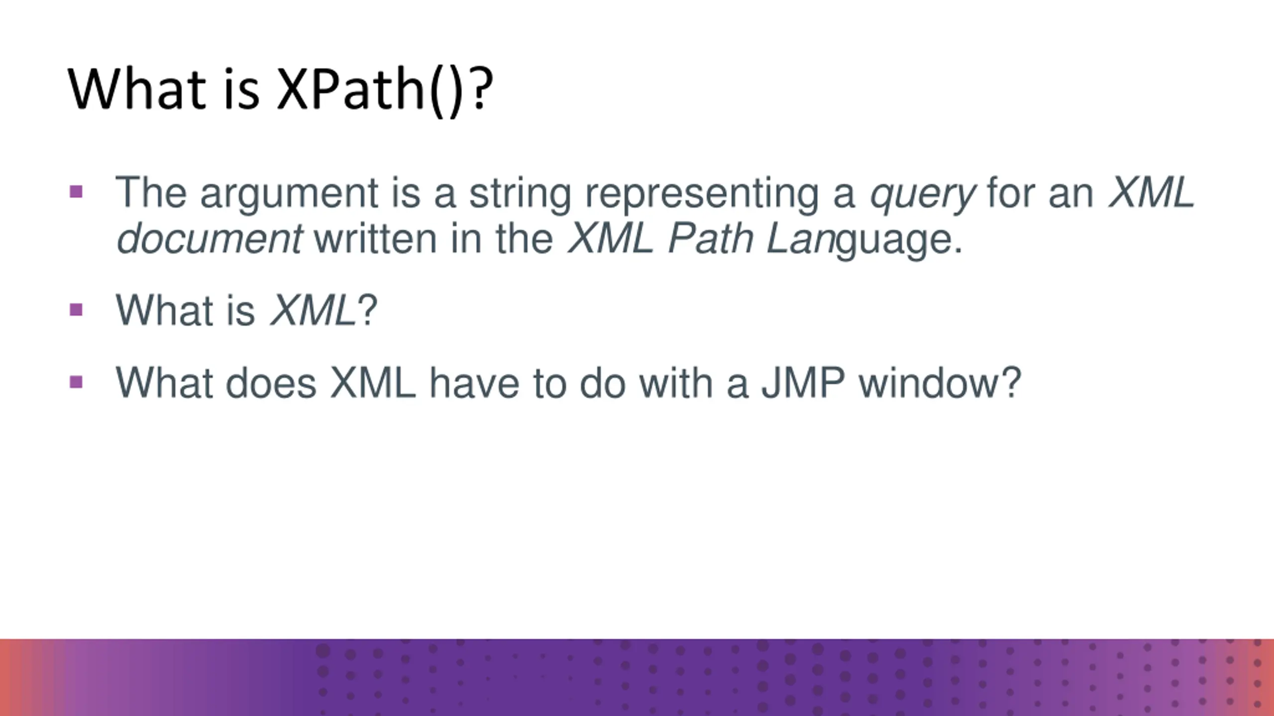 What is XPath()? The argument is a string representing a query for an XML document written in the XML Path Language. What is XML? What does XML have to do with a JMP window?