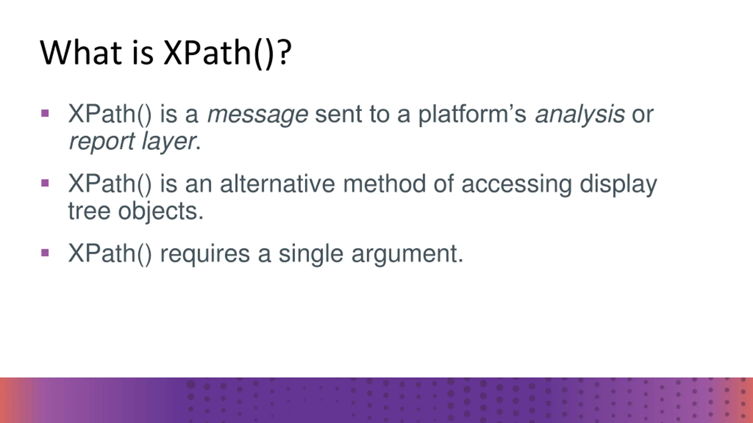 What is XPath()? XPath() is a message sent to a platform s analysis or report layer. XPath() is an alternative method of accessing display tree objects. XPath() requires a single argument.