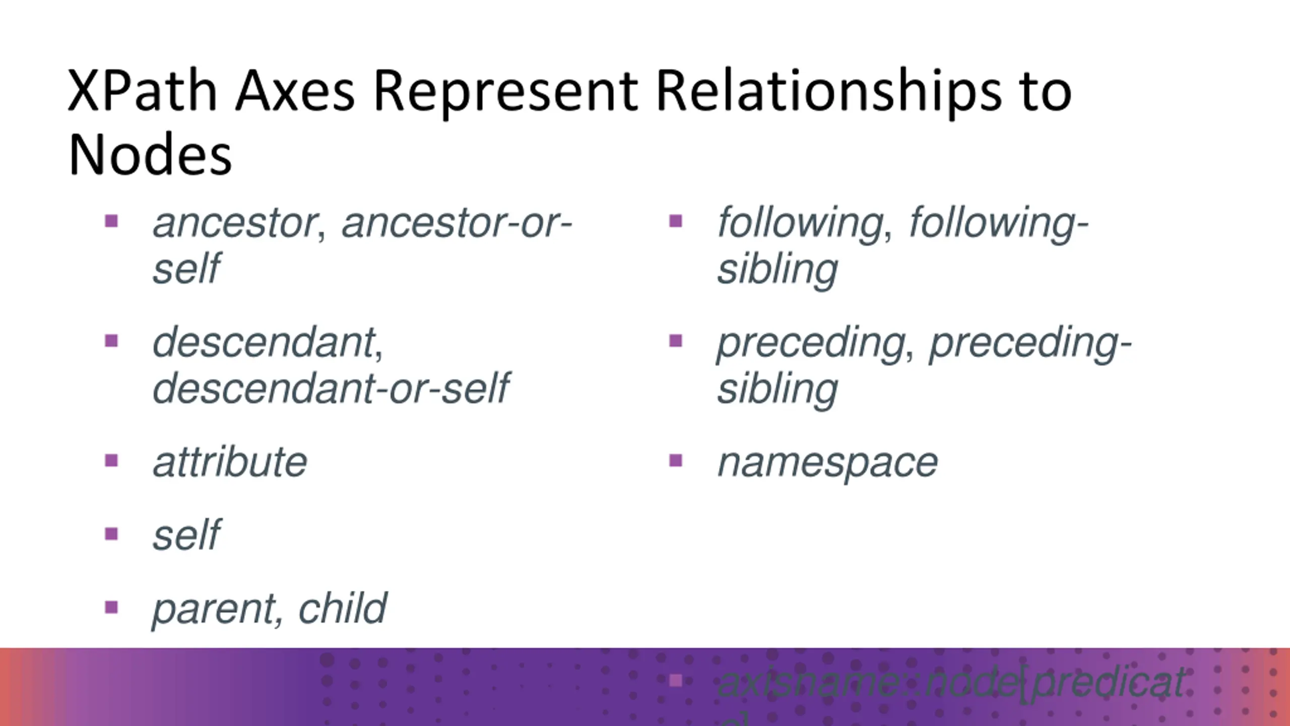XPath Axes Represent Relationships to Nodes ancestor, ancestor-or- self following, following- sibling descendant, descendant-or-self preceding, preceding- sibling attribute namespace self parent, child axisname::node[predicat e]