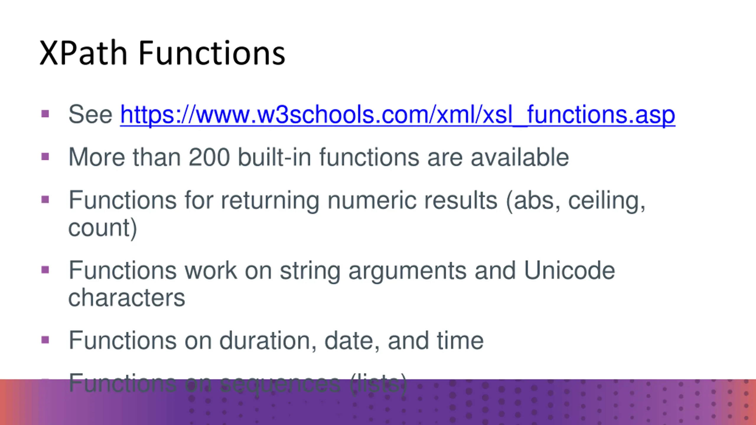 XPath Functions See https://www.w3schools.com/xml/xsl_functions.asp More than 200 built-in functions are available Functions for returning numeric results (abs, ceiling, count) Functions work on string arguments and Unicode characters Functions on duration, date, and time Functions on sequences (lists)