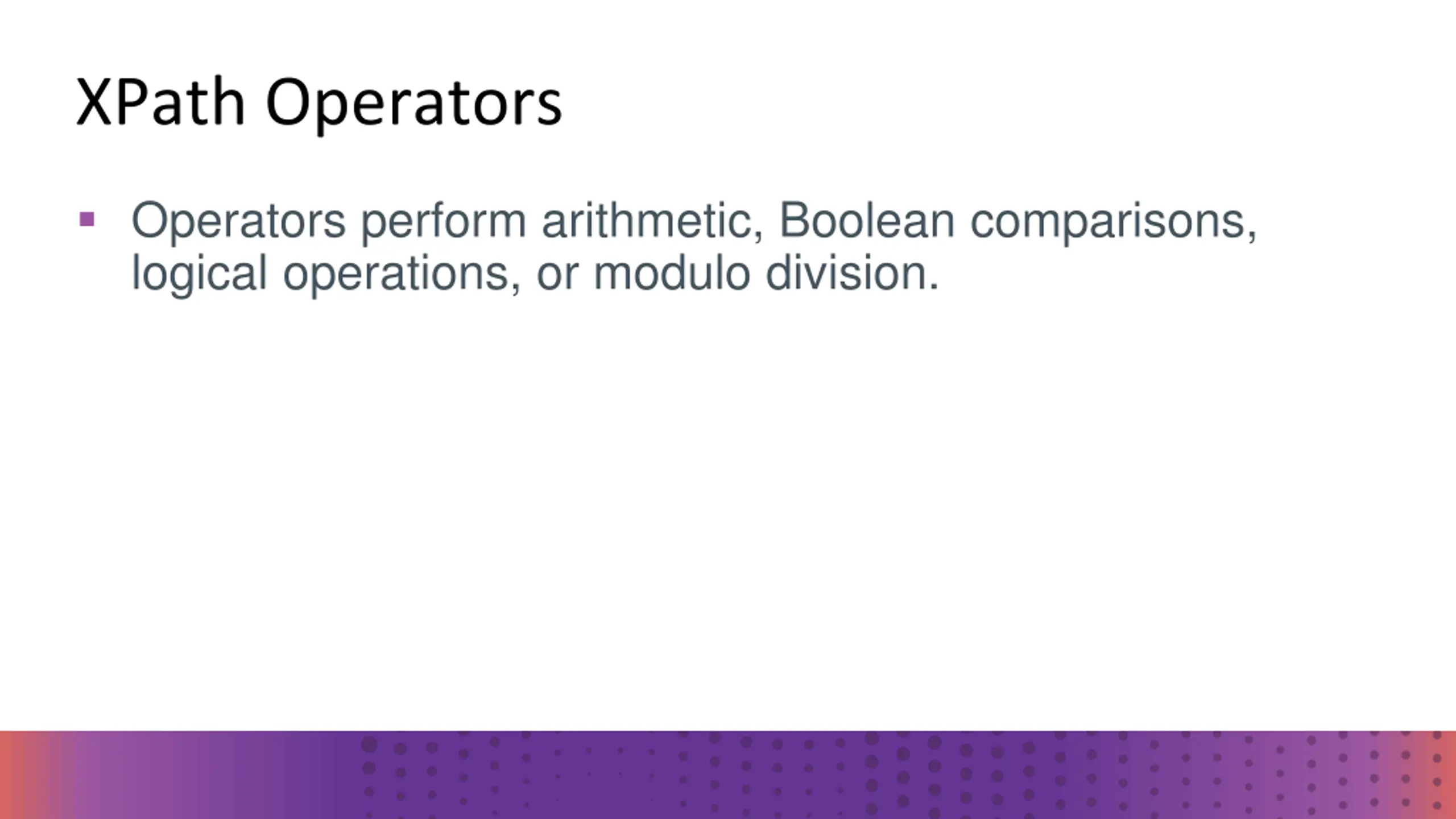 XPath Operators Operators perform arithmetic, Boolean comparisons, logical operations, or modulo division.