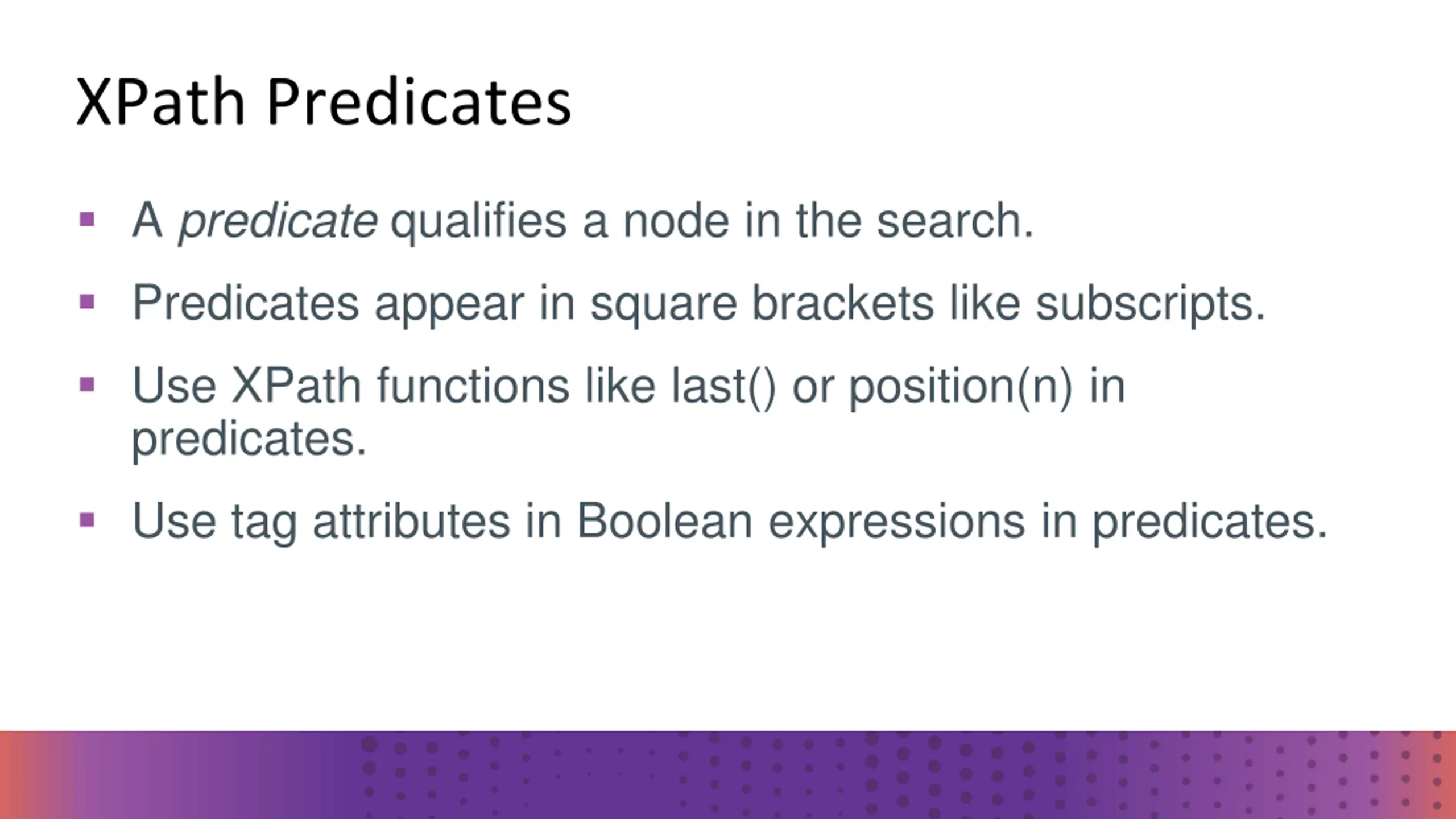 XPath Predicates A predicate qualifies a node in the search. Predicates appear in square brackets like subscripts. Use XPath functions like last() or position(n) in predicates. Use tag attributes in Boolean expressions in predicates.