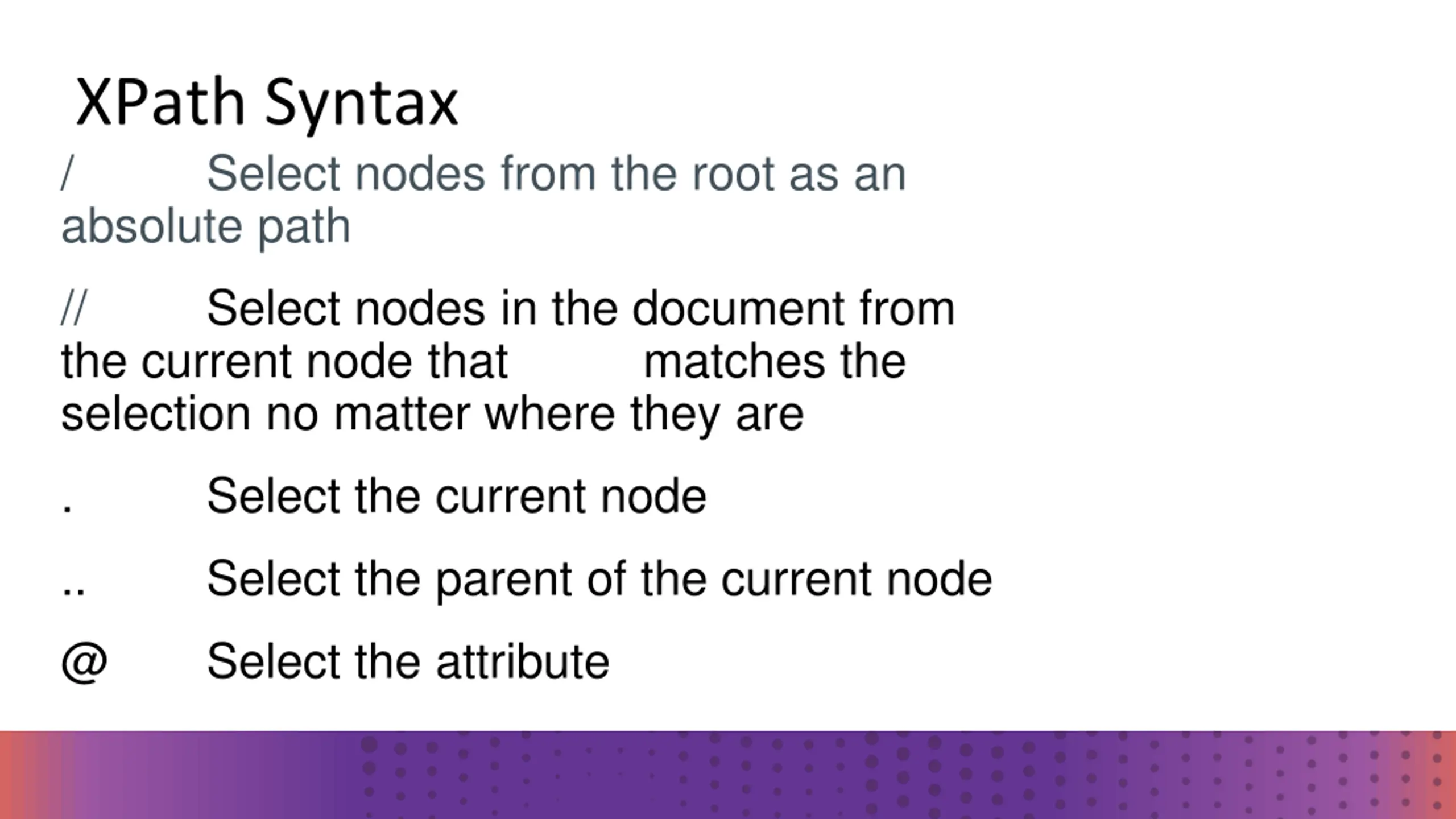 XPath Syntax Select nodes from the root as an absolute path / // the current node that selection no matter where they are Select nodes in the document from matches the . Select the current node .. Select the parent of the current node @ Select the attribute