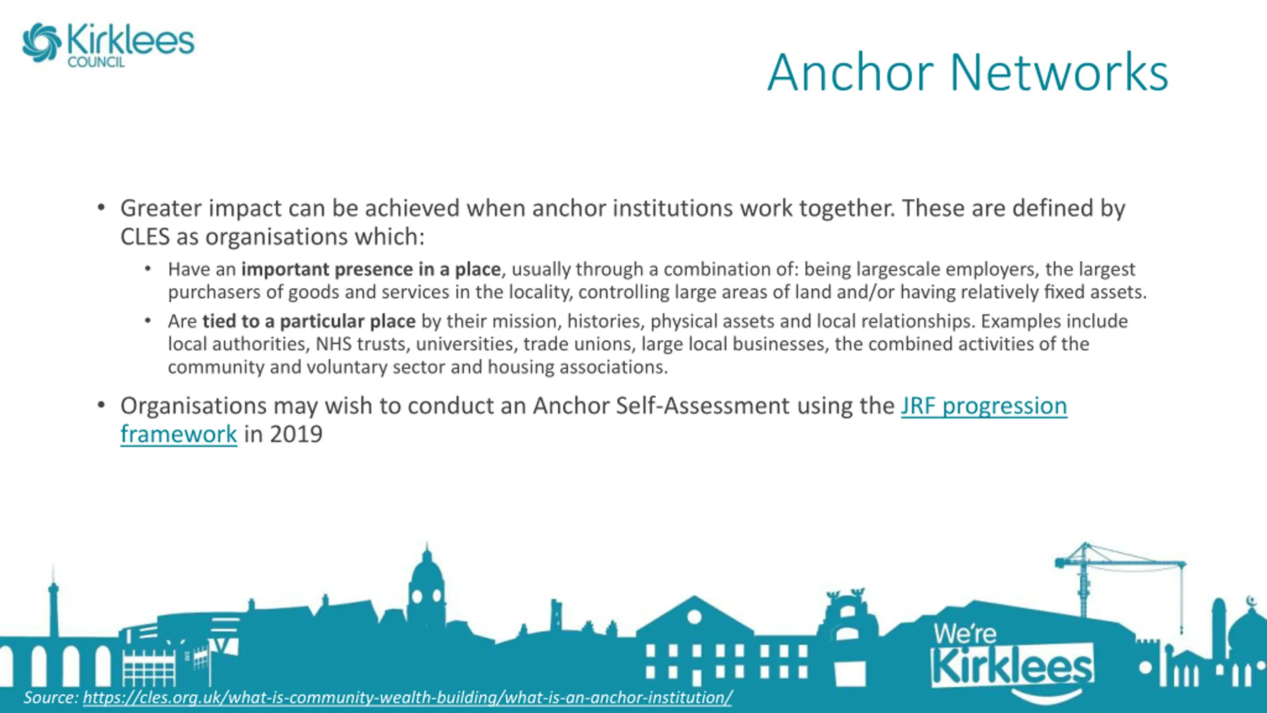 Anchor Networks Greater impact can be achieved when anchor institutions work together. These are defined by CLES as organisations which: Have an important presence in a place, usually through a combination of: being largescale employers, the largest purchasers of goods and services in the locality, controlling large areas of land and/or having relatively fixed assets. Are tied to a particular place by their mission, histories, physical assets and local relationships. Examples include local authorities, NHS trusts, universities, trade unions, large local businesses, the combined activities of the community and voluntary sector and housing associations. Organisations may wish to conduct an Anchor Self-Assessment using the JRF progression framework in 2019 Source: https://cles.org.uk/what-is-community-wealth-building/what-is-an-anchor-institution/
