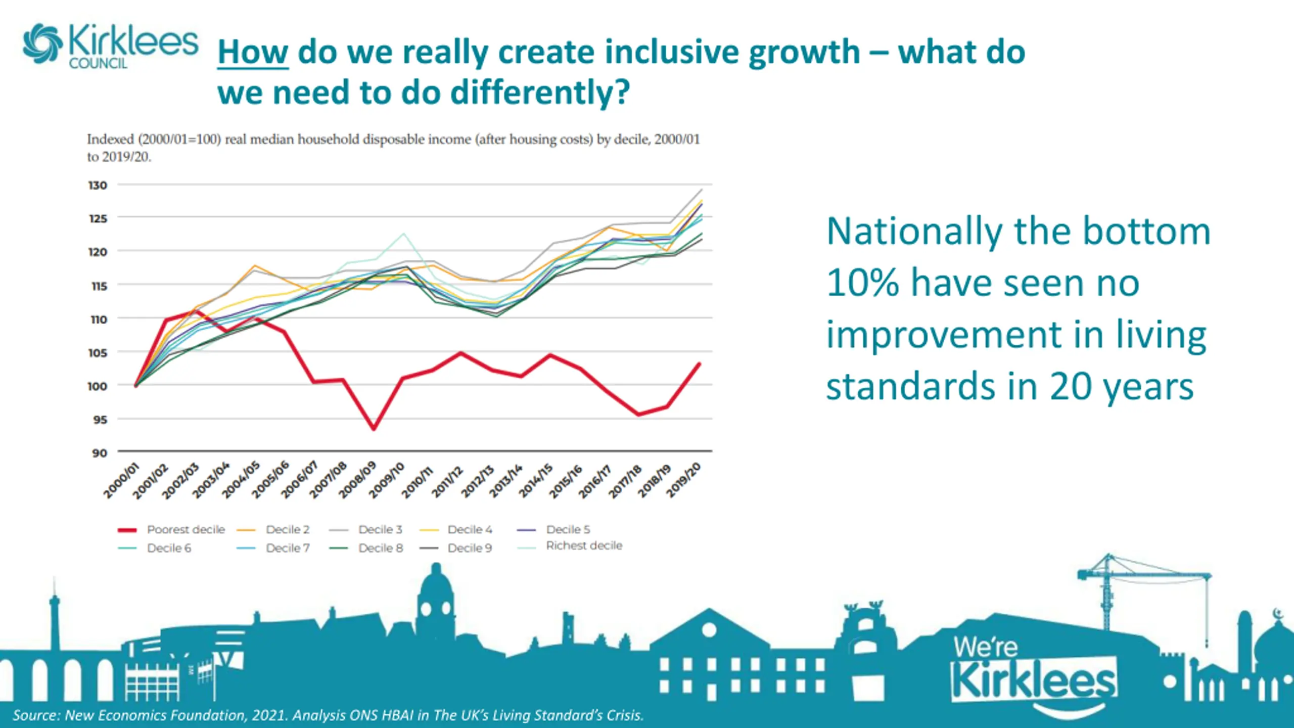 How do we really create inclusive growth what do we need to do differently? Nationally the bottom 10% have seen no improvement in living standards in 20 years Source: New Economics Foundation, 2021. Analysis ONS HBAI in The UK s Living Standard s Crisis.