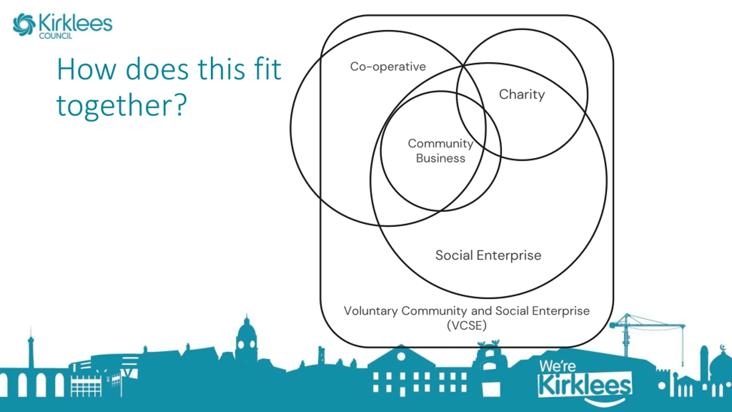 How does this fit together? Co-operative Charity Community Business Social Enterprise Voluntary Community and Social Enterprise (VCSE)