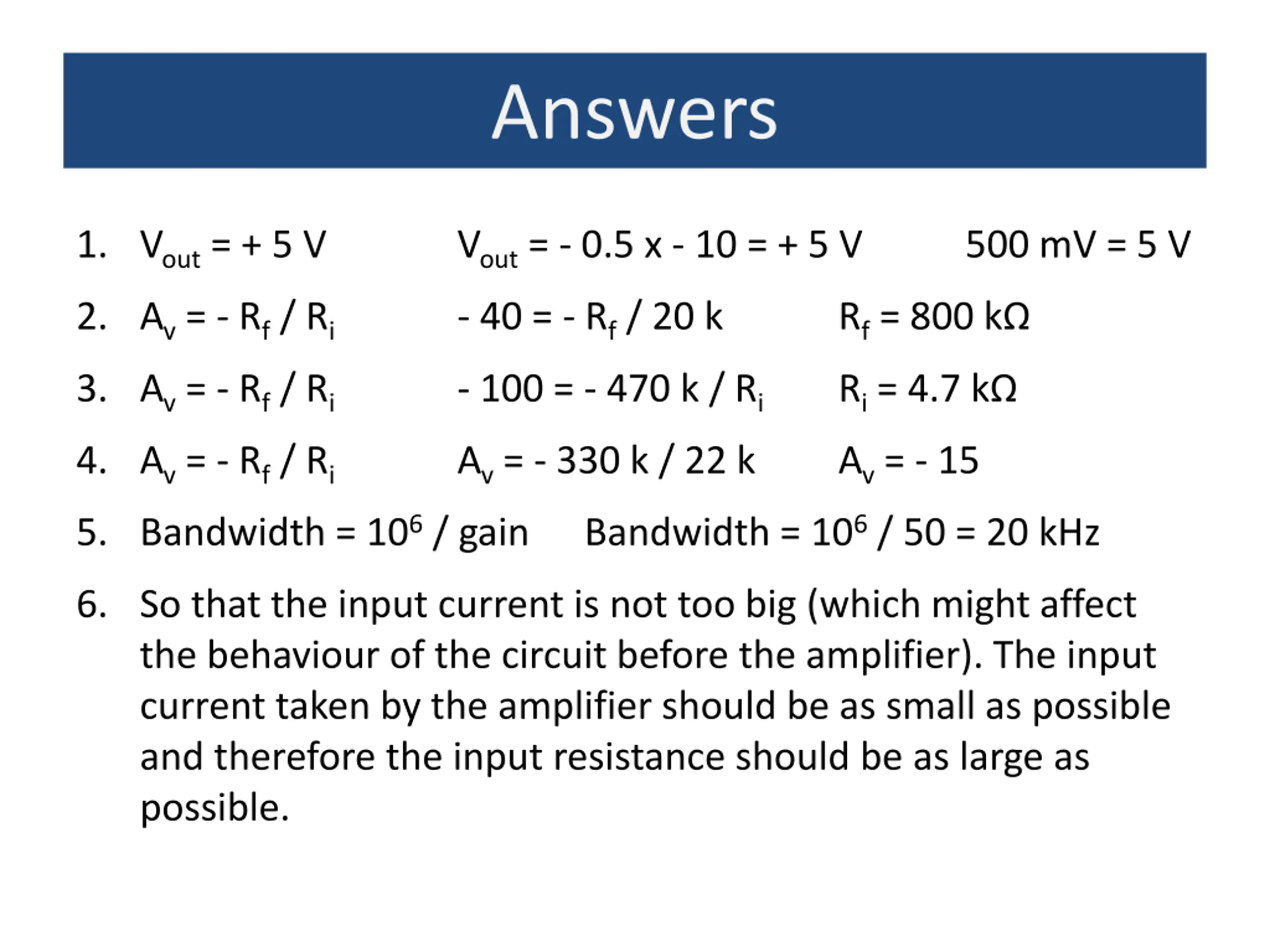 Answers 1. Vout = + 5 V Vout = - 0.5 x - 10 = + 5 V 500 mV = 5 V 2. Av = - Rf / Ri - 40 = - Rf / 20 k Rf= 800 k 3. Av = - Rf / Ri - 100 = - 470 k / Ri Ri= 4.7 k 4. Av = - Rf / Ri 5. Bandwidth = 106 / gain Av = - 330 k / 22 k Bandwidth = 106 / 50 = 20 kHz Av = - 15 6. So that the input current is not too big (which might affect the behaviour of the circuit before the amplifier). The input current taken by the amplifier should be as small as possible and therefore the input resistance should be as large as possible.