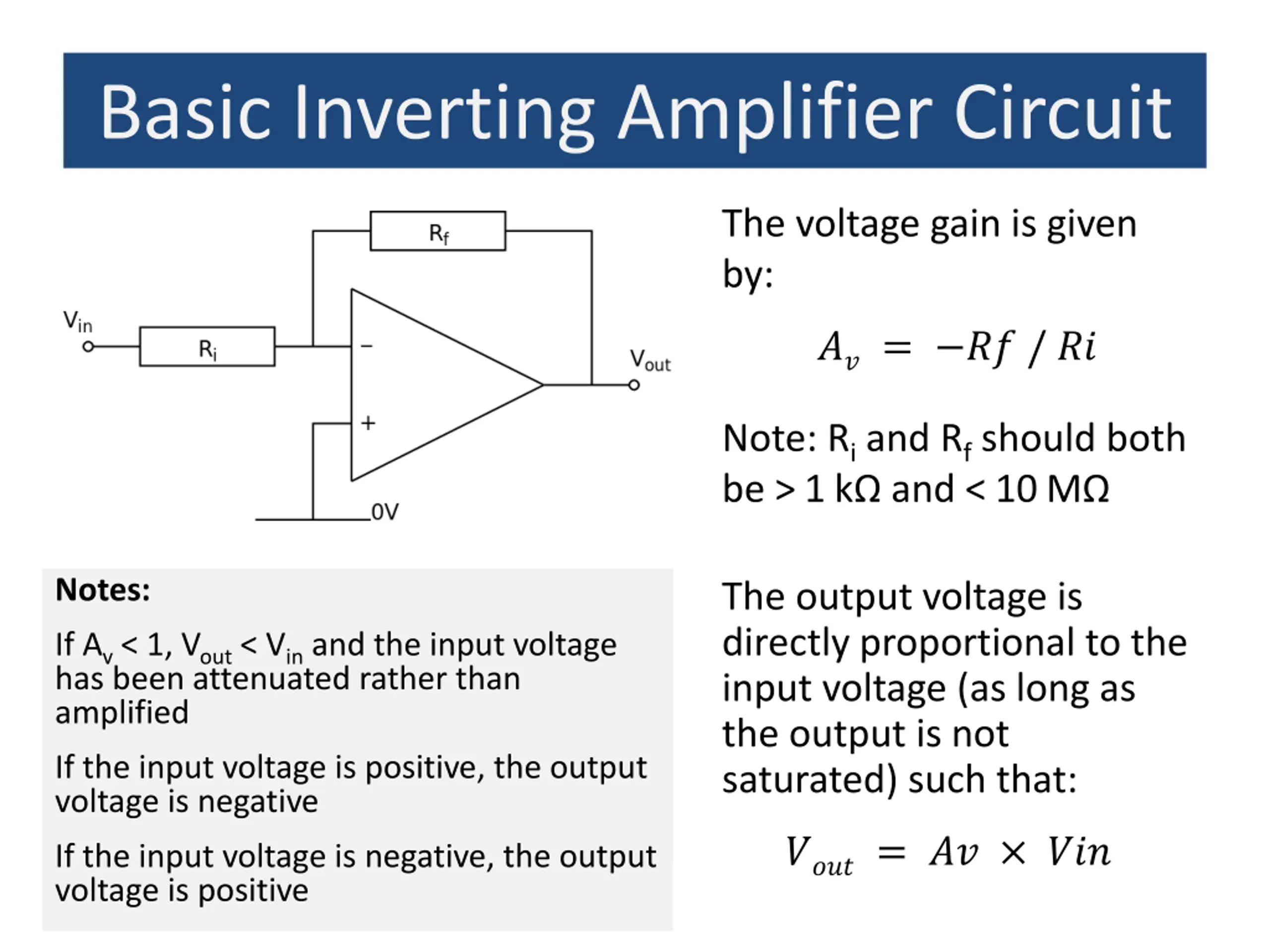 Basic Inverting Amplifier Circuit The voltage gain is given by: ?? = ?? / ?? Note: Ri and Rf should both be > 1 k and < 10 M Notes: The output voltage is directly proportional to the input voltage (as long as the output is not saturated) such that: If Av < 1, Vout < Vin and the input voltage has been attenuated rather than amplified If the input voltage is positive, the output voltage is negative ???? = ?? ??? If the input voltage is negative, the output voltage is positive