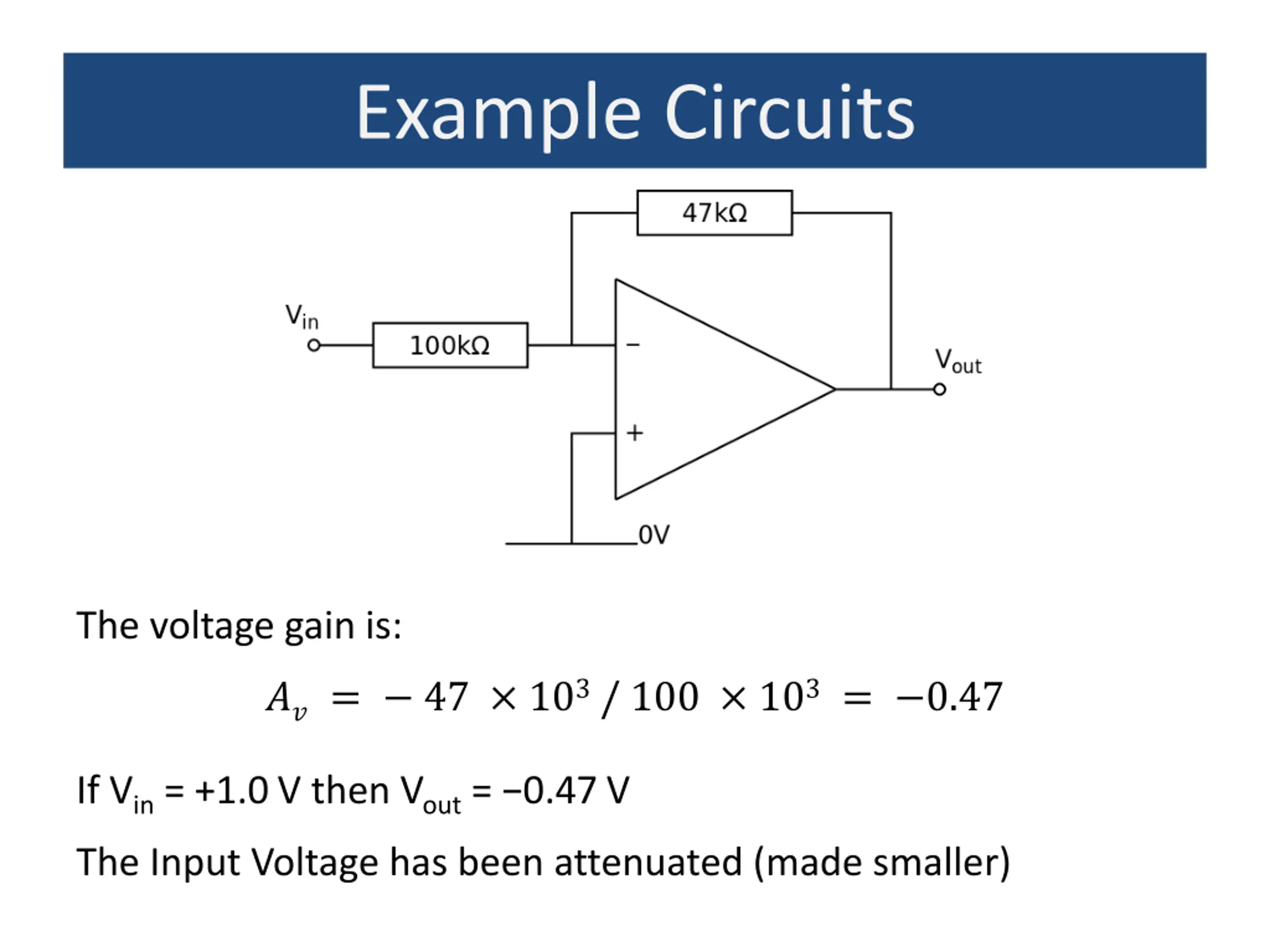 Example Circuits The voltage gain is: ?? = 47 103 / 100 103 = 0.47 If Vin= +1.0 V then Vout= 0.47 V The Input Voltage has been attenuated (made smaller)