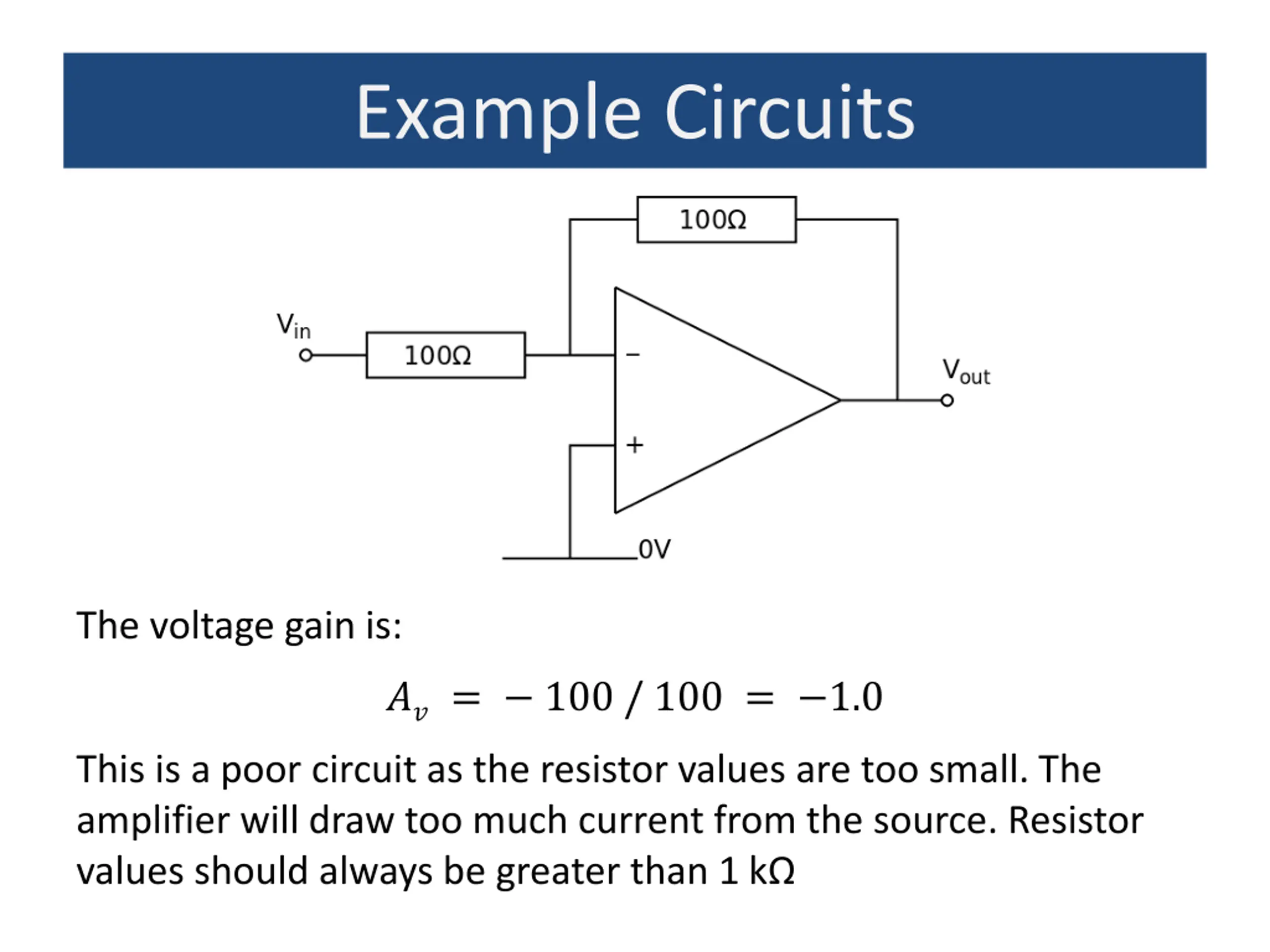 Example Circuits The voltage gain is: ?? = 100 / 100 = 1.0 This is a poor circuit as the resistor values are too small. The amplifier will draw too much current from the source. Resistor values should always be greater than 1 k