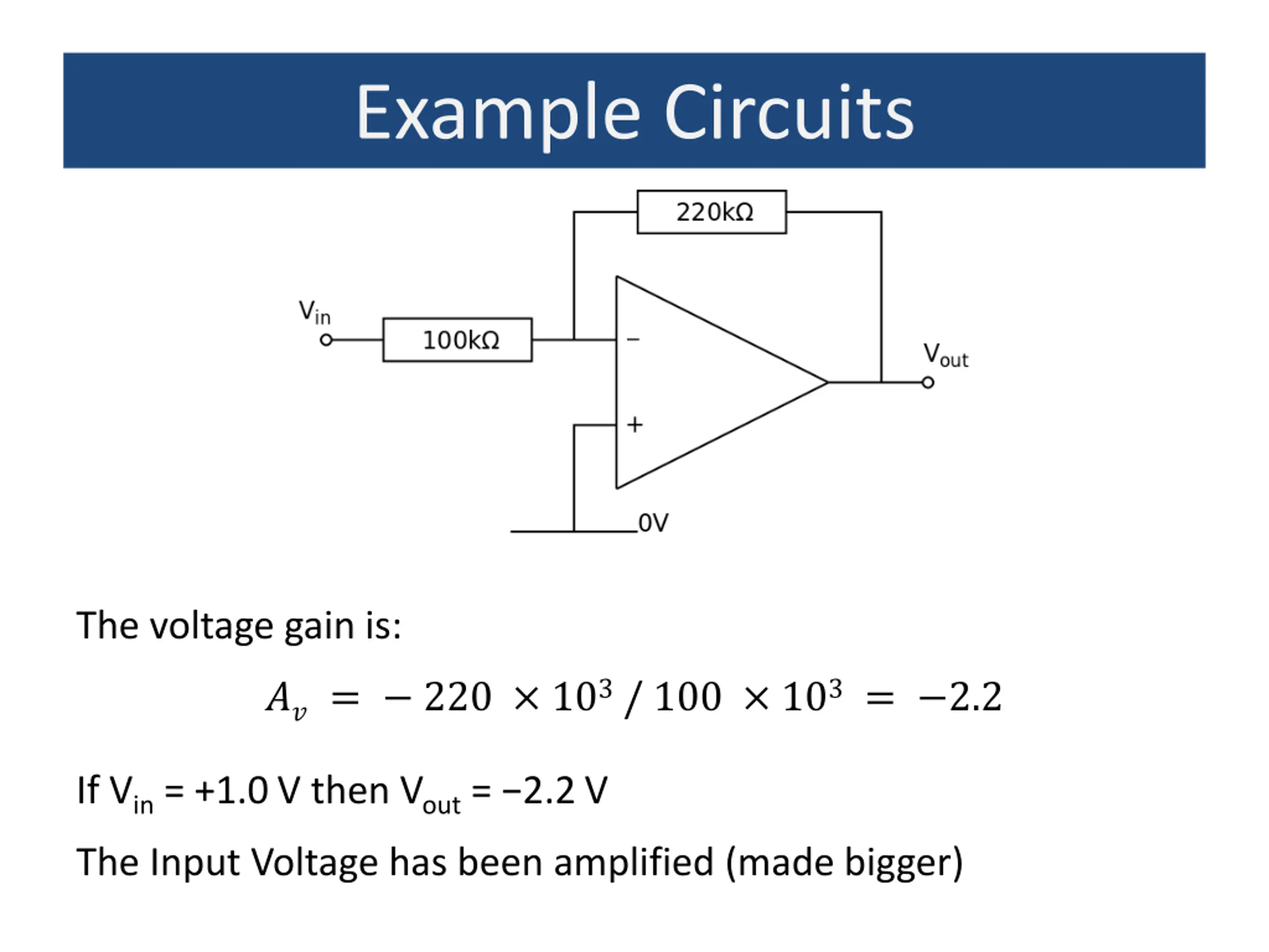 Example Circuits The voltage gain is: ?? = 220 103 / 100 103 = 2.2 If Vin= +1.0 V then Vout= 2.2 V The Input Voltage has been amplified (made bigger)