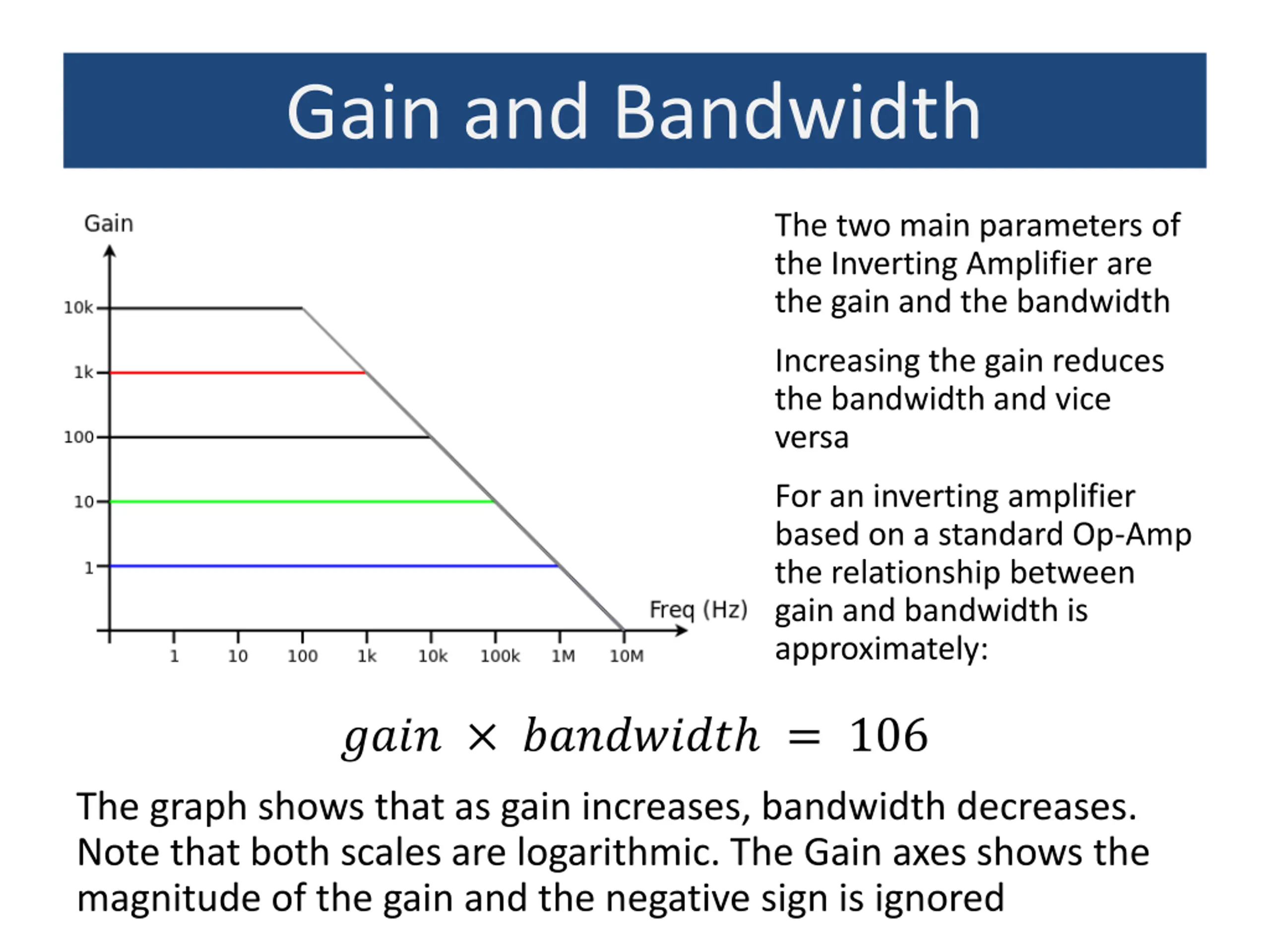 Gain and Bandwidth The two main parameters of the Inverting Amplifier are the gain and the bandwidth Increasing the gain reduces the bandwidth and vice versa For an inverting amplifier based on a standard Op-Amp the relationship between gain and bandwidth is approximately: ???? ???????? = 106 The graph shows that as gain increases, bandwidth decreases. Note that both scales are logarithmic. The Gain axes shows the magnitude of the gain and the negative sign is ignored