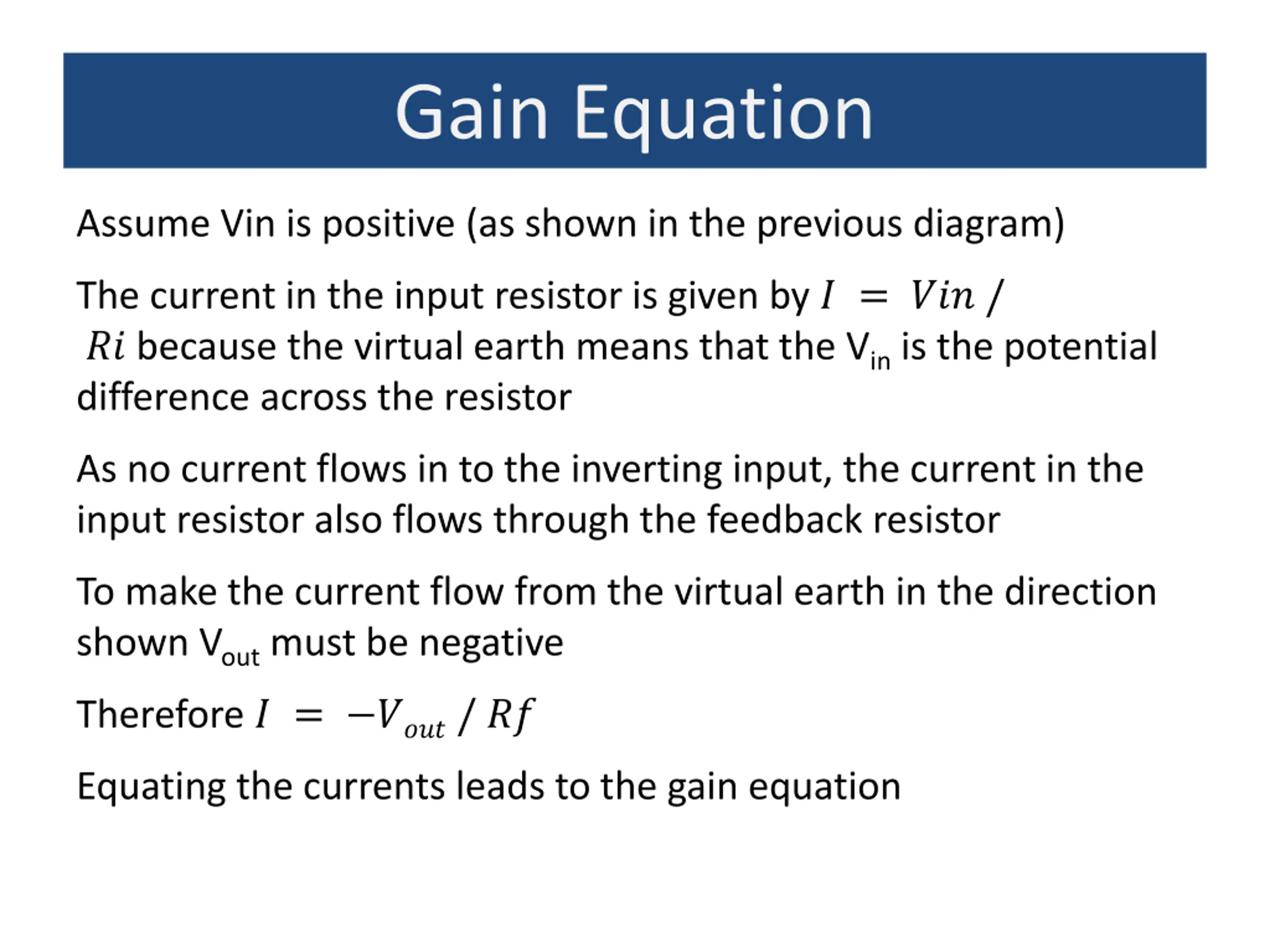Gain Equation Assume Vin is positive (as shown in the previous diagram) The current in the input resistor is given by ? = ??? / ?? because the virtual earth means that the Vin is the potential difference across the resistor As no current flows in to the inverting input, the current in the input resistor also flows through the feedback resistor To make the current flow from the virtual earth in the direction shown Vout must be negative Therefore ? = ???? / ?? Equating the currents leads to the gain equation