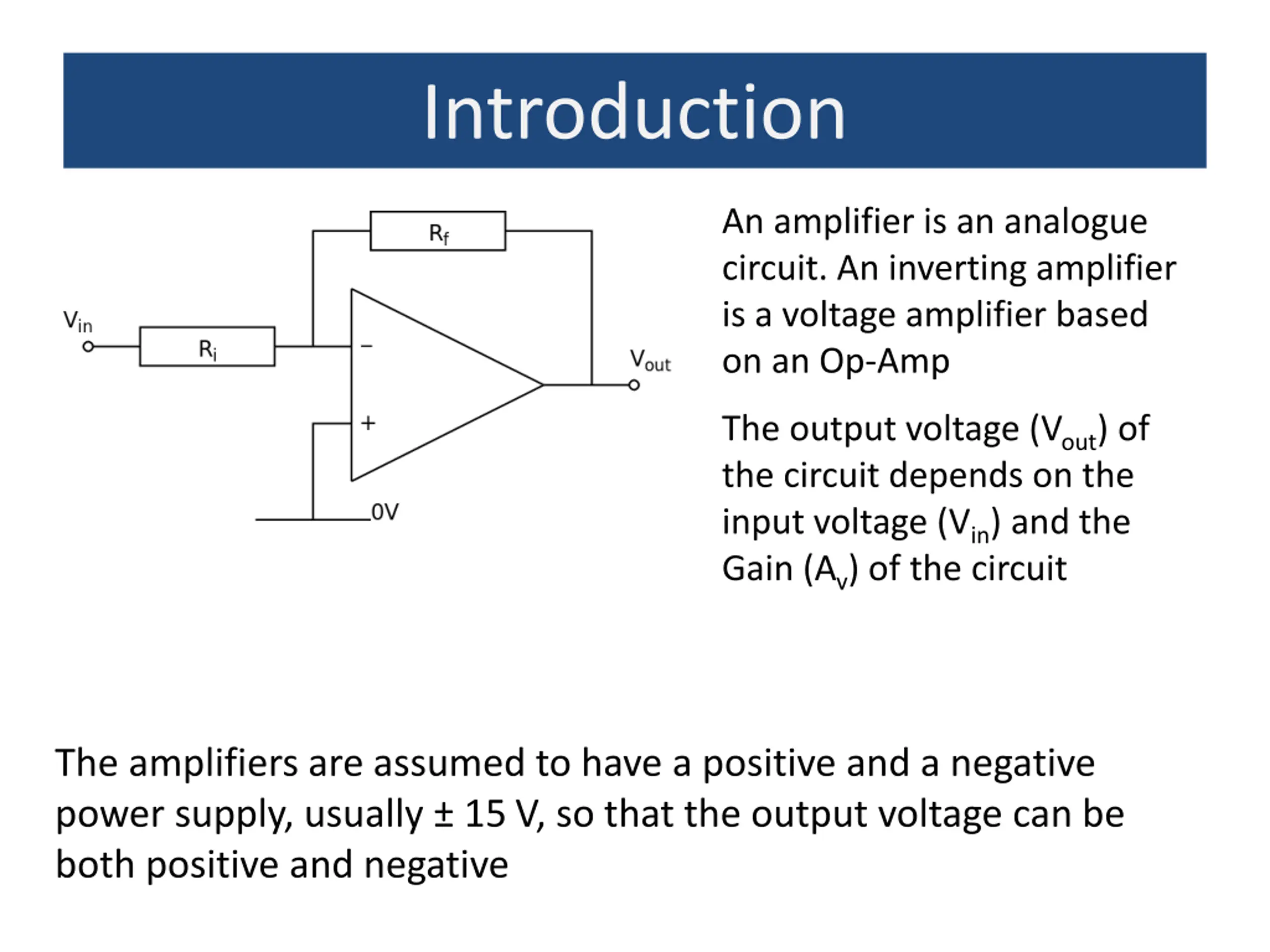 Introduction An amplifier is an analogue circuit. An inverting amplifier is a voltage amplifier based on an Op-Amp The output voltage (Vout) of the circuit depends on the input voltage (Vin) and the Gain (Av) of the circuit The amplifiers are assumed to have a positive and a negative power supply, usually 15 V, so that the output voltage can be both positive and negative