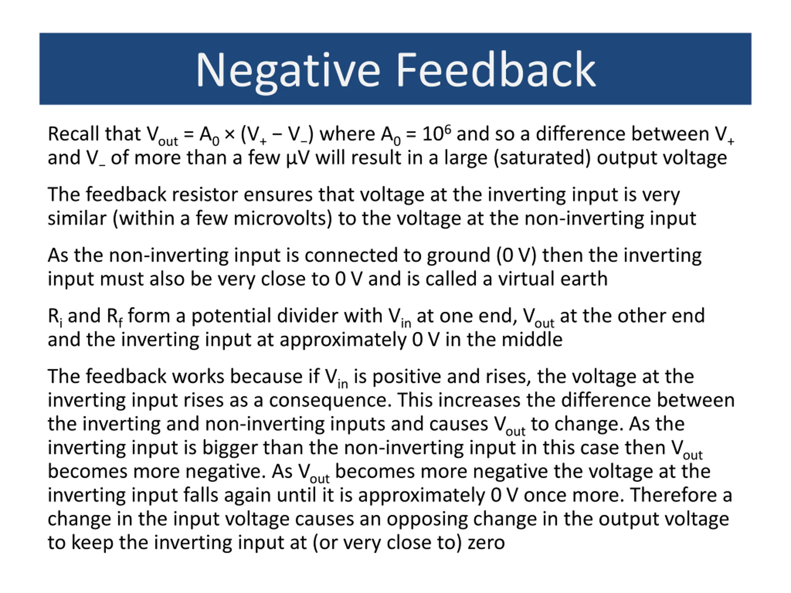 Negative Feedback Recall that Vout = A0 (V+ V ) where A0 = 106 and so a difference between V+ and V of more than a few V will result in a large (saturated) output voltage The feedback resistor ensures that voltage at the inverting input is very similar (within a few microvolts) to the voltage at the non-inverting input As the non-inverting input is connected to ground (0 V) then the inverting input must also be very close to 0 V and is called a virtual earth Ri and Rf form a potential divider with Vin at one end, Vout at the other end and the inverting input at approximately 0 V in the middle The feedback works because if Vin is positive and rises, the voltage at the inverting input rises as a consequence. This increases the difference between the inverting and non-inverting inputs and causes Vout to change. As the inverting input is bigger than the non-inverting input in this case then Vout becomes more negative. As Vout becomes more negative the voltage at the inverting input falls again until it is approximately 0 V once more. Therefore a change in the input voltage causes an opposing change in the output voltage to keep the inverting input at (or very close to) zero