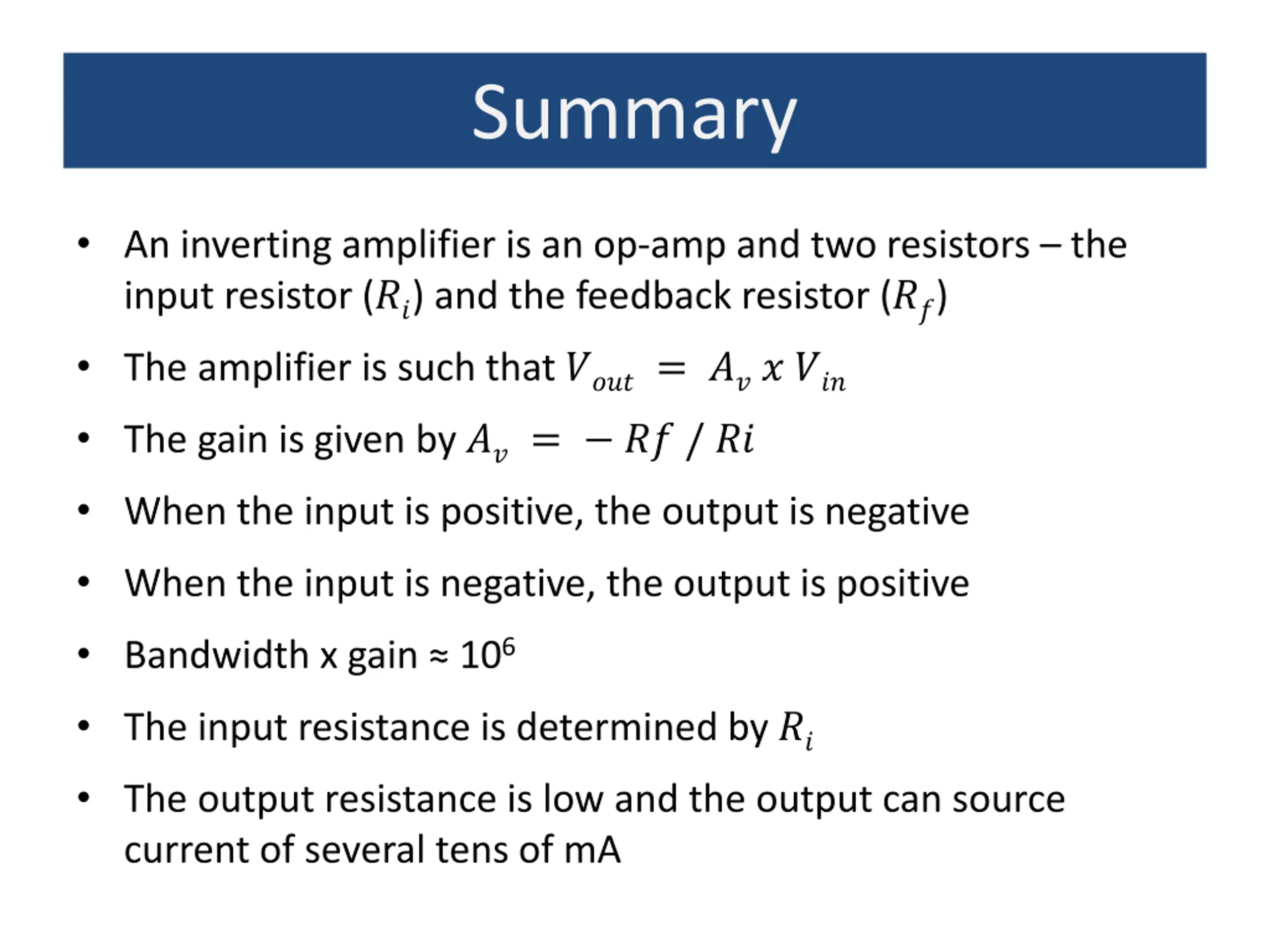 Summary An inverting amplifier is an op-amp and two resistors the input resistor (??) and the feedback resistor (??) The amplifier is such that ???? = ?? ? ??? The gain is given by ?? = ?? / ?? When the input is positive, the output is negative When the input is negative, the output is positive Bandwidth x gain 106 The input resistance is determined by ?? The output resistance is low and the output can source current of several tens of mA