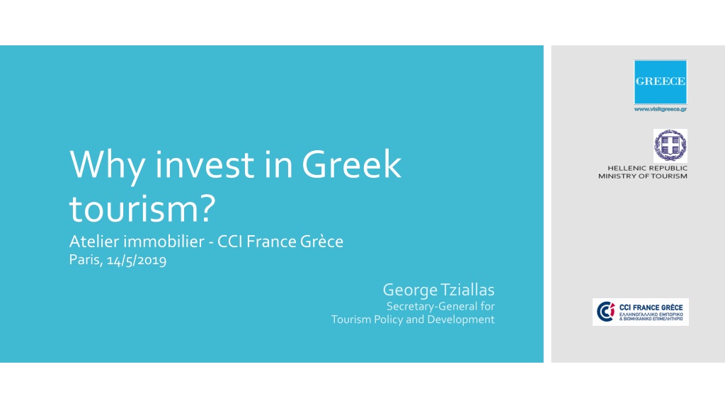 Why invest in Greek tourism? Atelier immobilier -CCI France Gr ce Paris, 14/5/2019 George Tziallas Secretary-General for Tourism Policy and Development