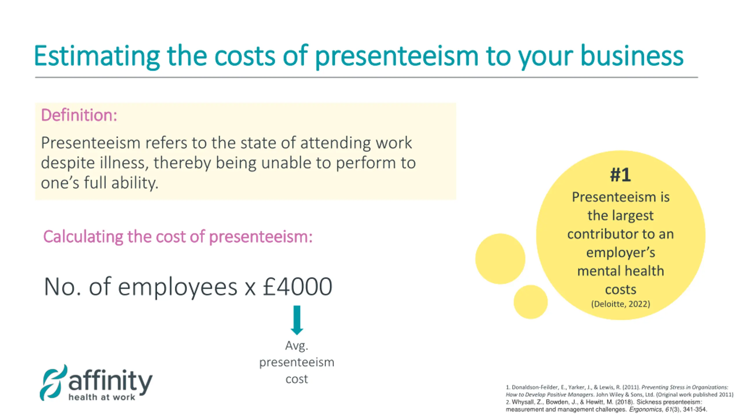 Estimating the costs of presenteeism to your business Estimating the costs of presenteeism to your business Definition: Definition: Presenteeism refers to the state of attending work despite illness, thereby being unable to perform to one s full ability. #1 Presenteeism is the largest contributor to an employer s mental health costs (Deloitte, 2022) Calculating the cost of presenteeism: Calculating the cost of presenteeism: No. of employees x 4000 Avg. presenteeism cost 1. Donaldson-Feilder, E., Yarker, J., & Lewis, R. (2011). Preventing Stress in Organizations: How to Develop Positive Managers. John Wiley & Sons, Ltd. (Original work published 2011) 2. Whysall, Z., Bowden, J., & Hewitt, M. (2018). Sickness presenteeism: measurement and management challenges. Ergonomics, 61(3), 341-354.
