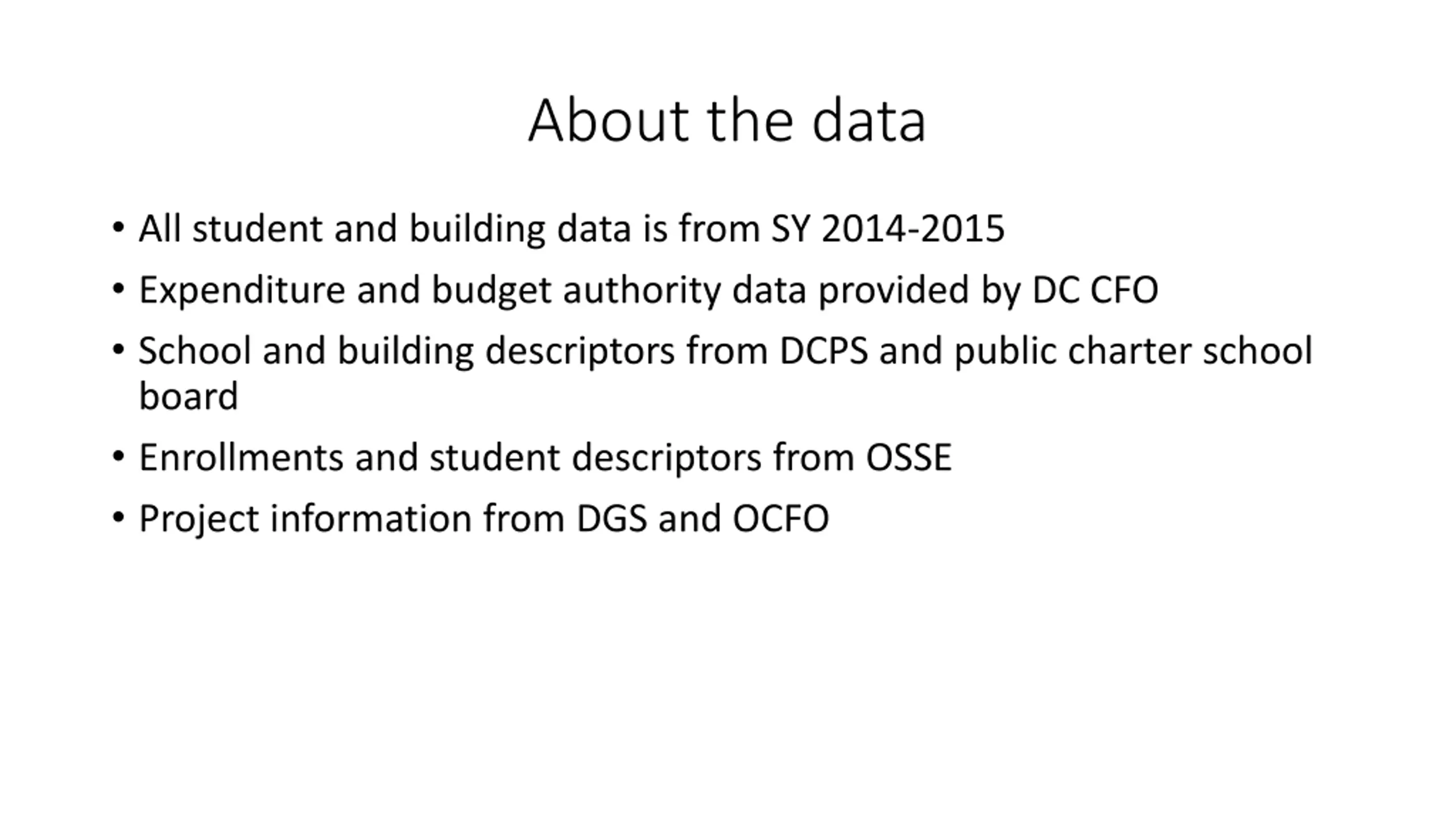 About the data All student and building data is from SY 2014-2015 Expenditure and budget authority data provided by DC CFO School and building descriptors from DCPS and public charter school board Enrollments and student descriptors from OSSE Project information from DGS and OCFO