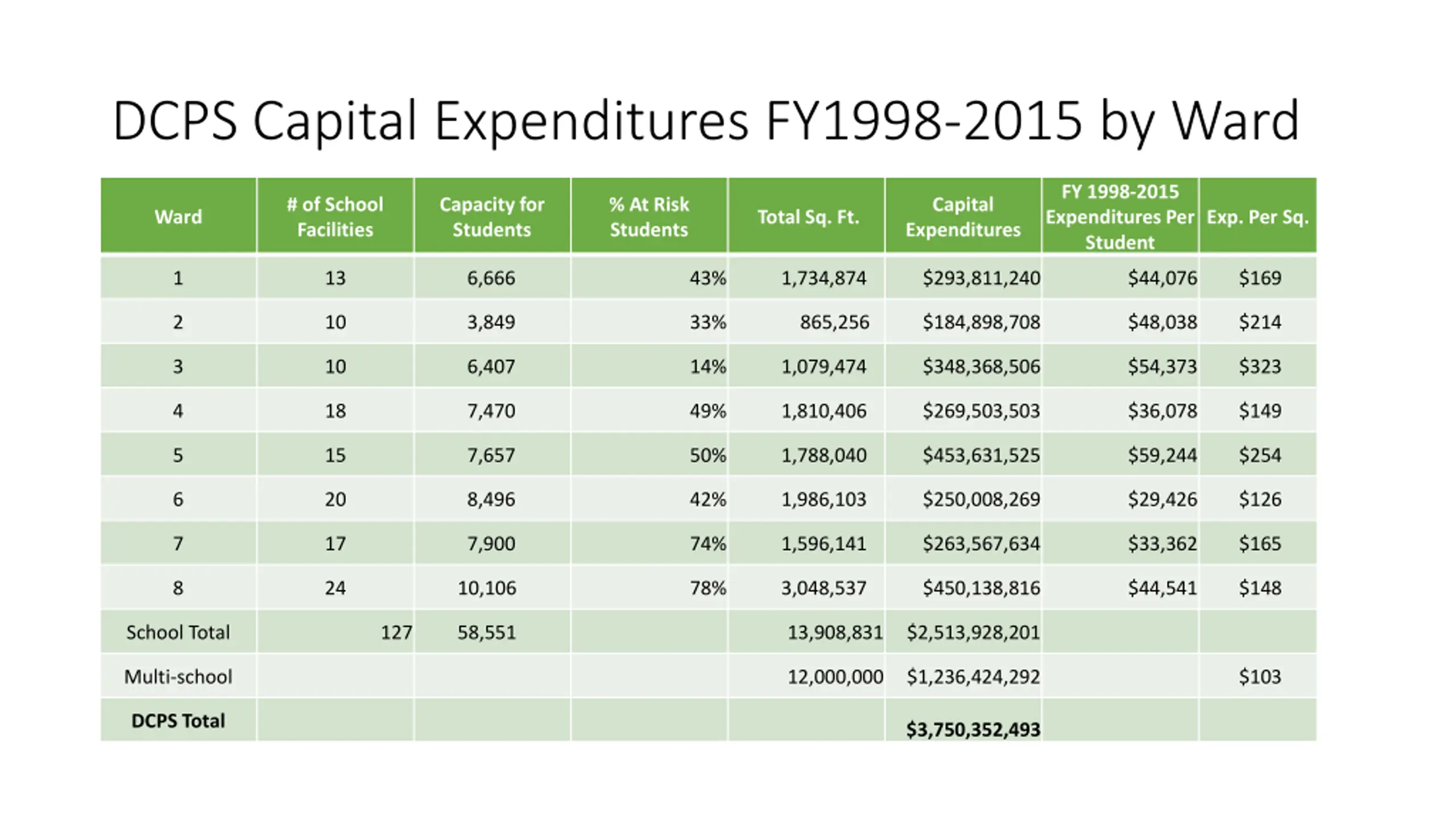 DCPS Capital Expenditures FY1998-2015 by Ward FY 1998-2015 Expenditures Per Student # of School Facilities Capacity for Students % At Risk Students Capital Expenditures Ward Total Sq. Ft. Exp. Per Sq. 1 13 6,666 43% 1,734,874 $293,811,240 $44,076 $169 2 10 3,849 33% 865,256 $184,898,708 $48,038 $214 3 10 6,407 14% 1,079,474 $348,368,506 $54,373 $323 4 18 7,470 49% 1,810,406 $269,503,503 $36,078 $149 5 15 7,657 50% 1,788,040 $453,631,525 $59,244 $254 6 20 8,496 42% 1,986,103 $250,008,269 $29,426 $126 7 17 7,900 74% 1,596,141 $263,567,634 $33,362 $165 8 24 10,106 78% 3,048,537 $450,138,816 $44,541 $148 School Total 127 58,551 13,908,831 $2,513,928,201 Multi-school 12,000,000 $1,236,424,292 $103 DCPS Total $3,750,352,493