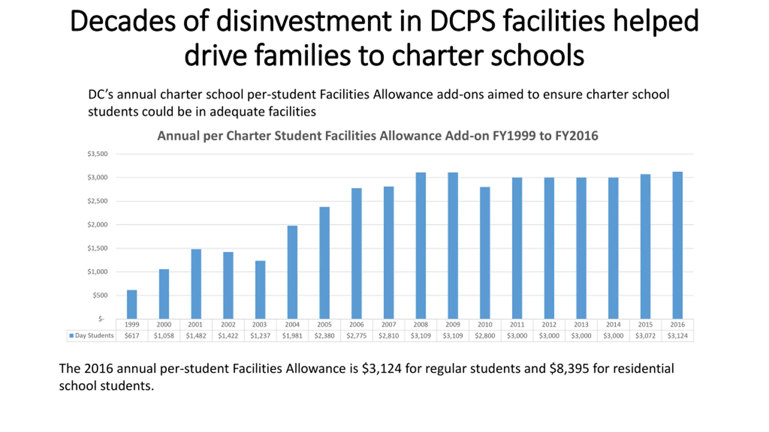 Decades of disinvestment in DCPS facilities Decades of disinvestment in DCPS facilities helped drive families drive families to charter schools to charter schools helped DC s annual charter school per-student Facilities Allowance add-ons aimed to ensure charter school students could be in adequate facilities Annual per Charter Student Facilities Allowance Add-on FY1999 to FY2016 $3,500 $3,000 $2,500 $2,000 $1,500 $1,000 $500 $- 1999 2000 2001 2002 2003 2004 2005 2006 2007 2008 2009 2010 2011 2012 2013 2014 2015 2016 Day Students $617 $1,058 $1,482 $1,422 $1,237 $1,981 $2,380 $2,775 $2,810 $3,109 $3,109 $2,800 $3,000 $3,000 $3,000 $3,000 $3,072 $3,124 The 2016 annual per-student Facilities Allowance is $3,124 for regular students and $8,395 for residential school students.