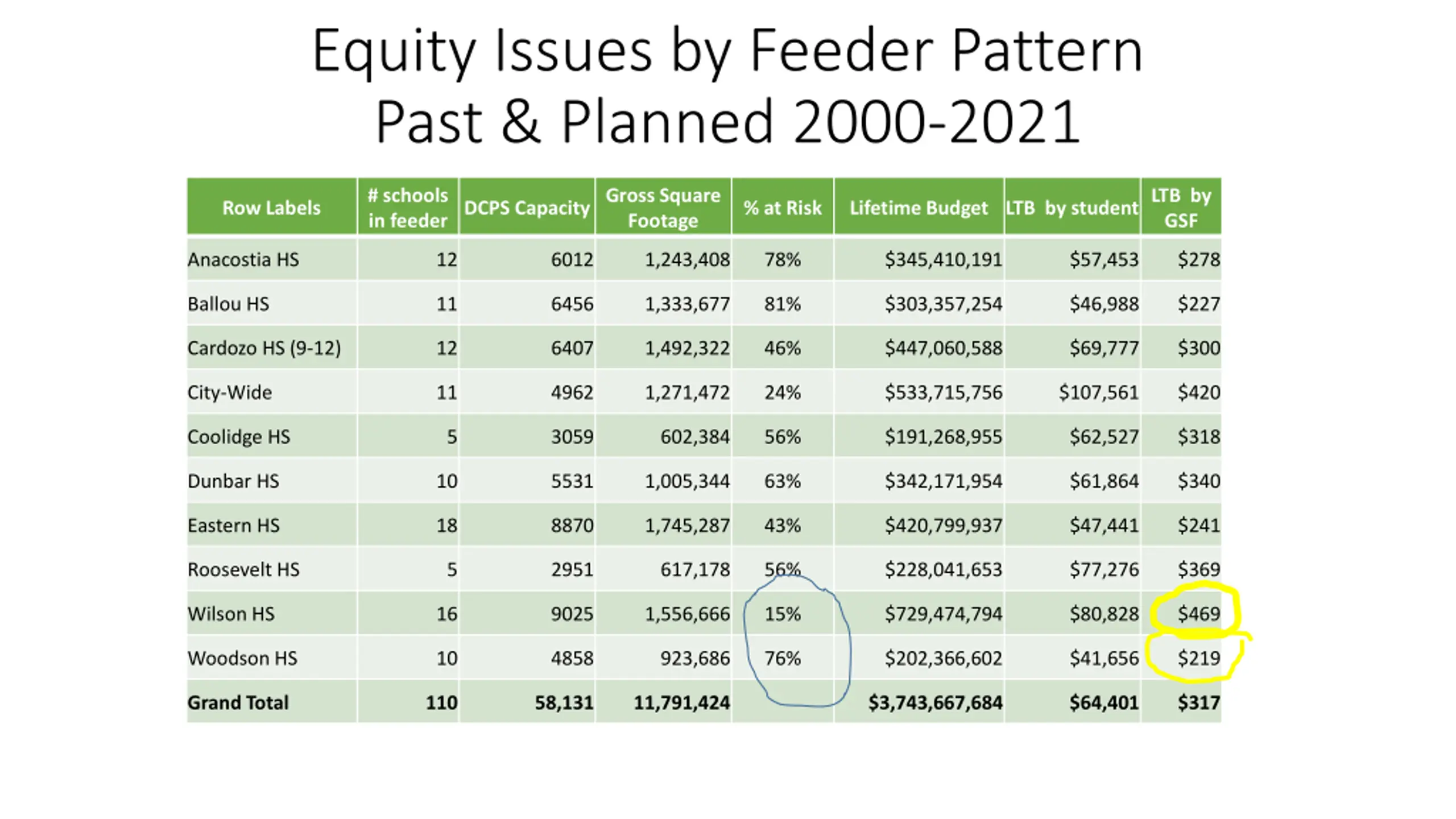 Equity Issues by Feeder Pattern Past & Planned 2000-2021 # schools in feeder Gross Square Footage Lifetime Budget LTB by studentLTB by Row Labels DCPS Capacity % at Risk GSF Anacostia HS 12 6012 1,243,408 78% $345,410,191 $57,453 $278 Ballou HS 11 6456 1,333,677 81% $303,357,254 $46,988 $227 Cardozo HS (9-12) 12 6407 1,492,322 46% $447,060,588 $69,777 $300 City-Wide 11 4962 1,271,472 24% $533,715,756 $107,561 $420 Coolidge HS 5 3059 602,384 56% $191,268,955 $62,527 $318 Dunbar HS 10 5531 1,005,344 63% $342,171,954 $61,864 $340 Eastern HS 18 8870 1,745,287 43% $420,799,937 $47,441 $241 Roosevelt HS 5 2951 617,178 56% $228,041,653 $77,276 $369 Wilson HS 16 9025 1,556,666 15% $729,474,794 $80,828 $469 Woodson HS 10 4858 923,686 76% $202,366,602 $41,656 $219 Grand Total 110 58,131 11,791,424 $3,743,667,684 $64,401 $317