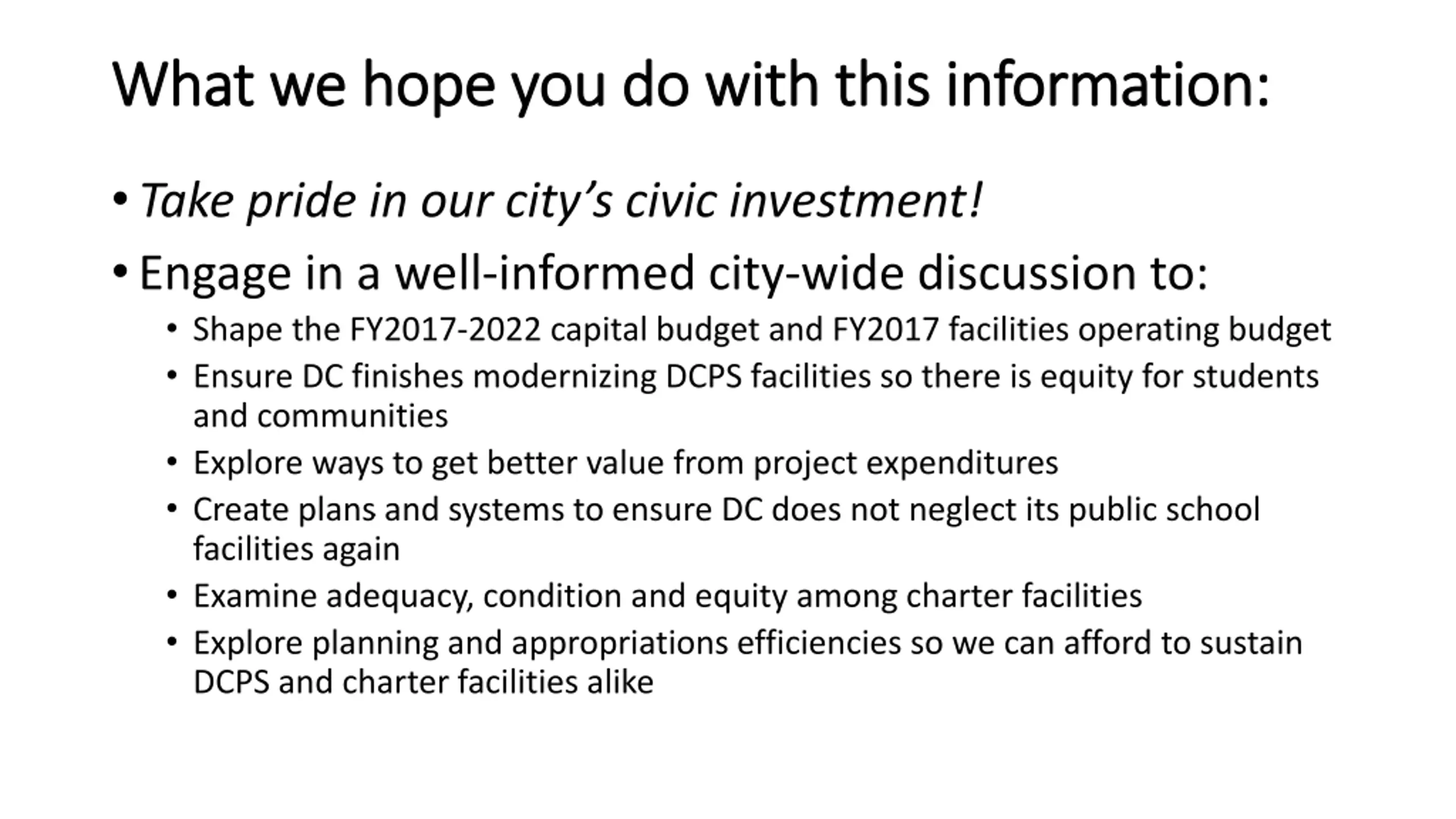 What we hope you do with this information: What we hope you do with this information: Take pride in our city s civic investment! Engage in a well-informed city-wide discussion to: Shape the FY2017-2022 capital budget and FY2017 facilities operating budget Ensure DC finishes modernizing DCPS facilities so there is equity for students and communities Explore ways to get better value from project expenditures Create plans and systems to ensure DC does not neglect its public school facilities again Examine adequacy, condition and equity among charter facilities Explore planning and appropriations efficiencies so we can afford to sustain DCPS and charter facilities alike