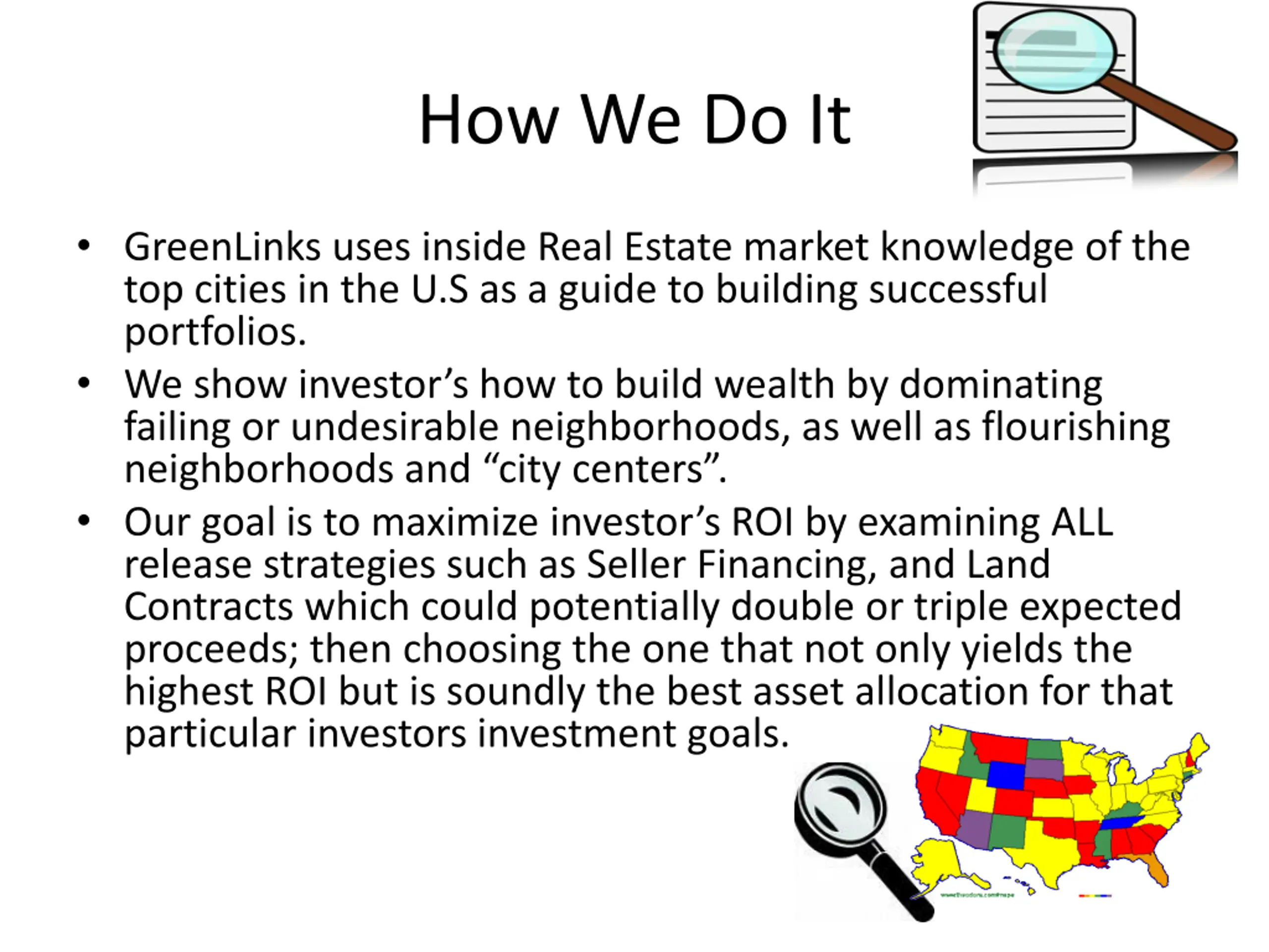 How We Do It GreenLinks uses inside Real Estate market knowledge of the top cities in the U.S as a guide to building successful portfolios. We show investor s how to build wealth by dominating failing or undesirable neighborhoods, as well as flourishing neighborhoods and city centers . Our goal is to maximize investor s ROI by examining ALL release strategies such as Seller Financing, and Land Contracts which could potentially double or triple expected proceeds; then choosing the one that not only yields the highest ROI but is soundly the best asset allocation for that particular investors investment goals.