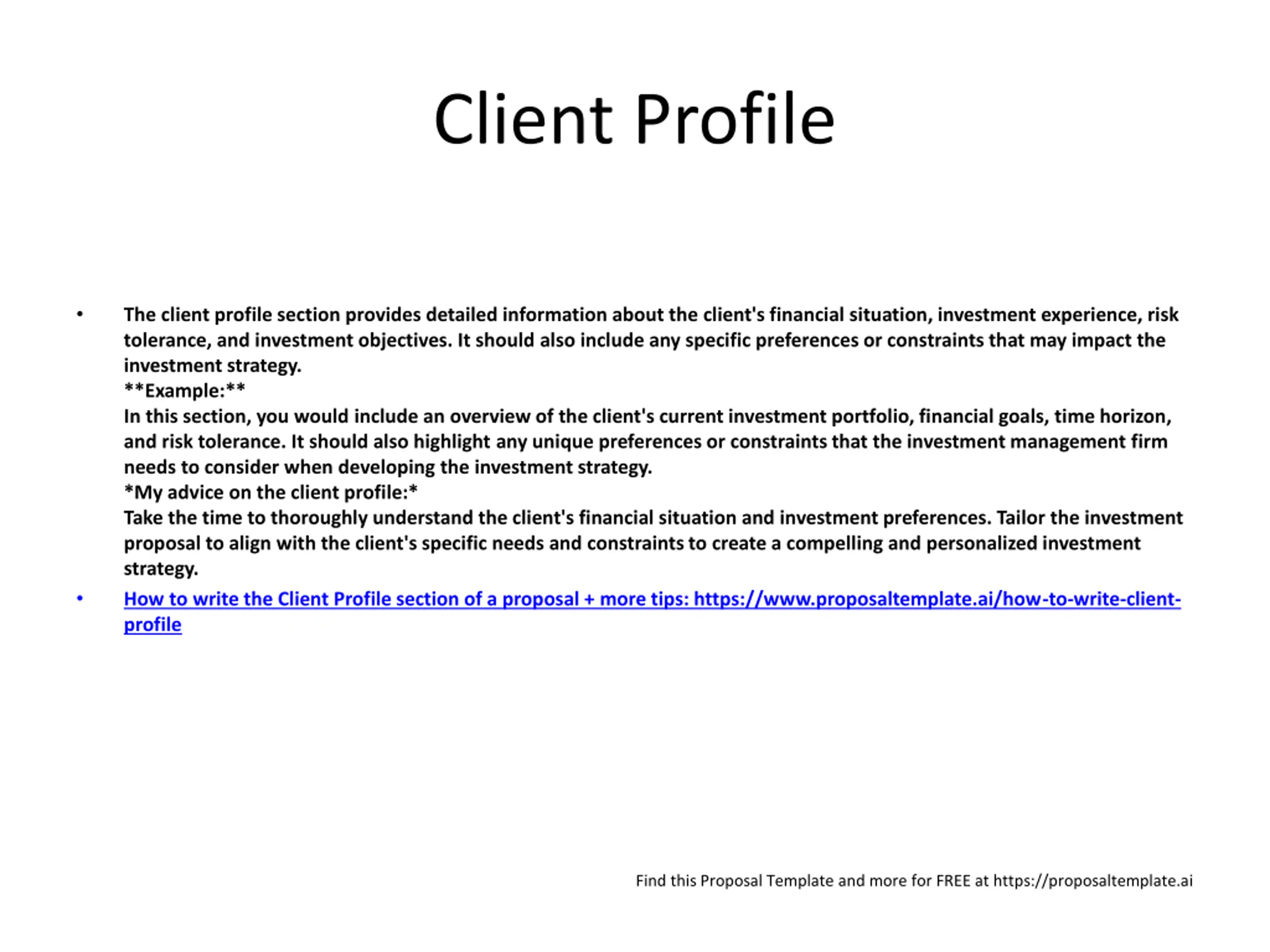 Client Profile The client profile section provides detailed information about the client's financial situation, investment experience, risk tolerance, and investment objectives. It should also include any specific preferences or constraints that may impact the investment strategy. **Example:** In this section, you would include an overview of the client's current investment portfolio, financial goals, time horizon, and risk tolerance. It should also highlight any unique preferences or constraints that the investment management firm needs to consider when developing the investment strategy. *My advice on the client profile:* Take the time to thoroughly understand the client's financial situation and investment preferences. Tailor the investment proposal to align with the client's specific needs and constraints to create a compelling and personalized investment strategy. How to write the Client Profile section of a proposal + more tips: https://www.proposaltemplate.ai/how-to-write-client- profile Find this Proposal Template and more for FREE at https://proposaltemplate.ai
