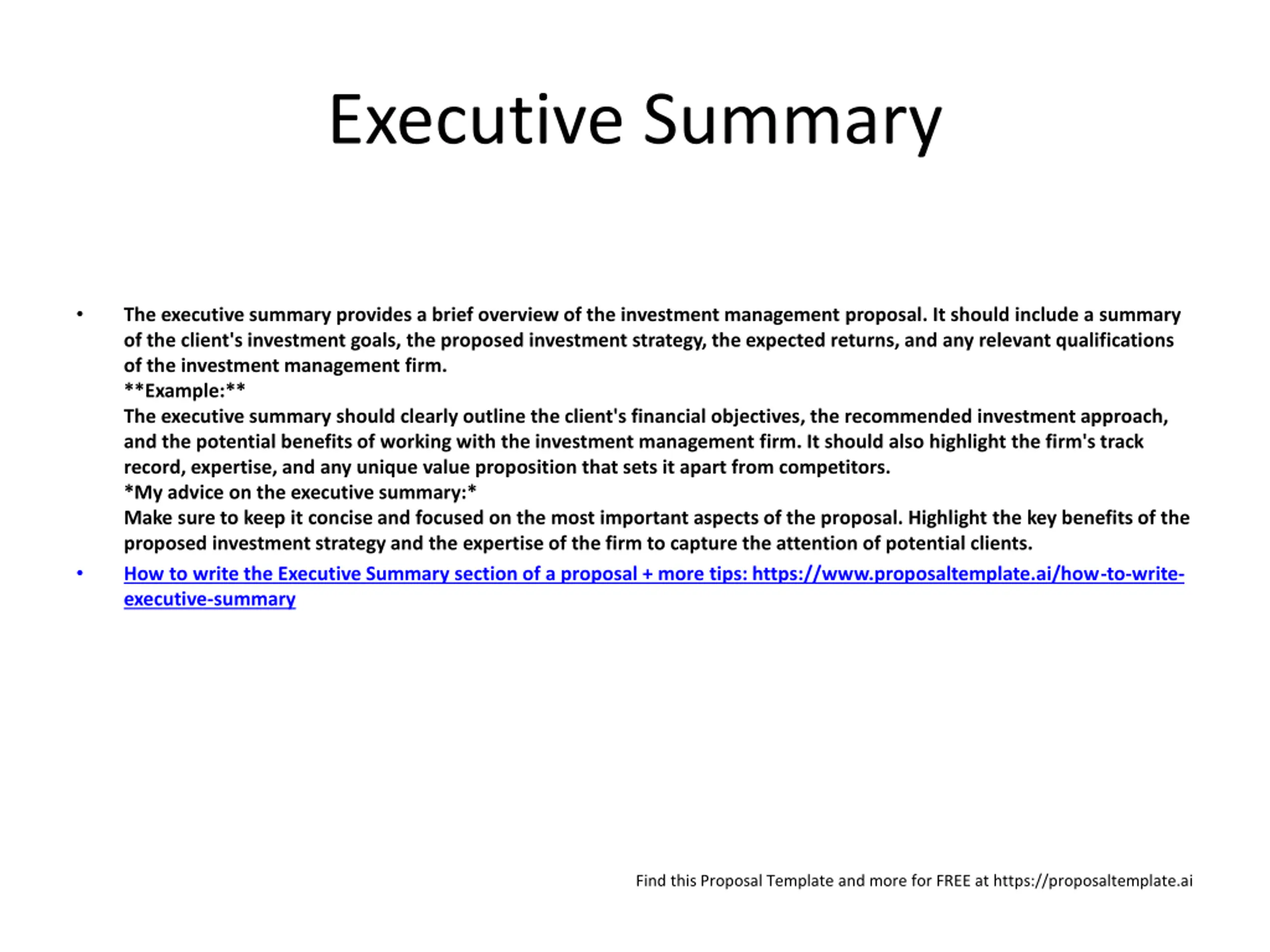 Executive Summary The executive summary provides a brief overview of the investment management proposal. It should include a summary of the client's investment goals, the proposed investment strategy, the expected returns, and any relevant qualifications of the investment management firm. **Example:** The executive summary should clearly outline the client's financial objectives, the recommended investment approach, and the potential benefits of working with the investment management firm. It should also highlight the firm's track record, expertise, and any unique value proposition that sets it apart from competitors. *My advice on the executive summary:* Make sure to keep it concise and focused on the most important aspects of the proposal. Highlight the key benefits of the proposed investment strategy and the expertise of the firm to capture the attention of potential clients. How to write the Executive Summary section of a proposal + more tips: https://www.proposaltemplate.ai/how-to-write- executive-summary Find this Proposal Template and more for FREE at https://proposaltemplate.ai