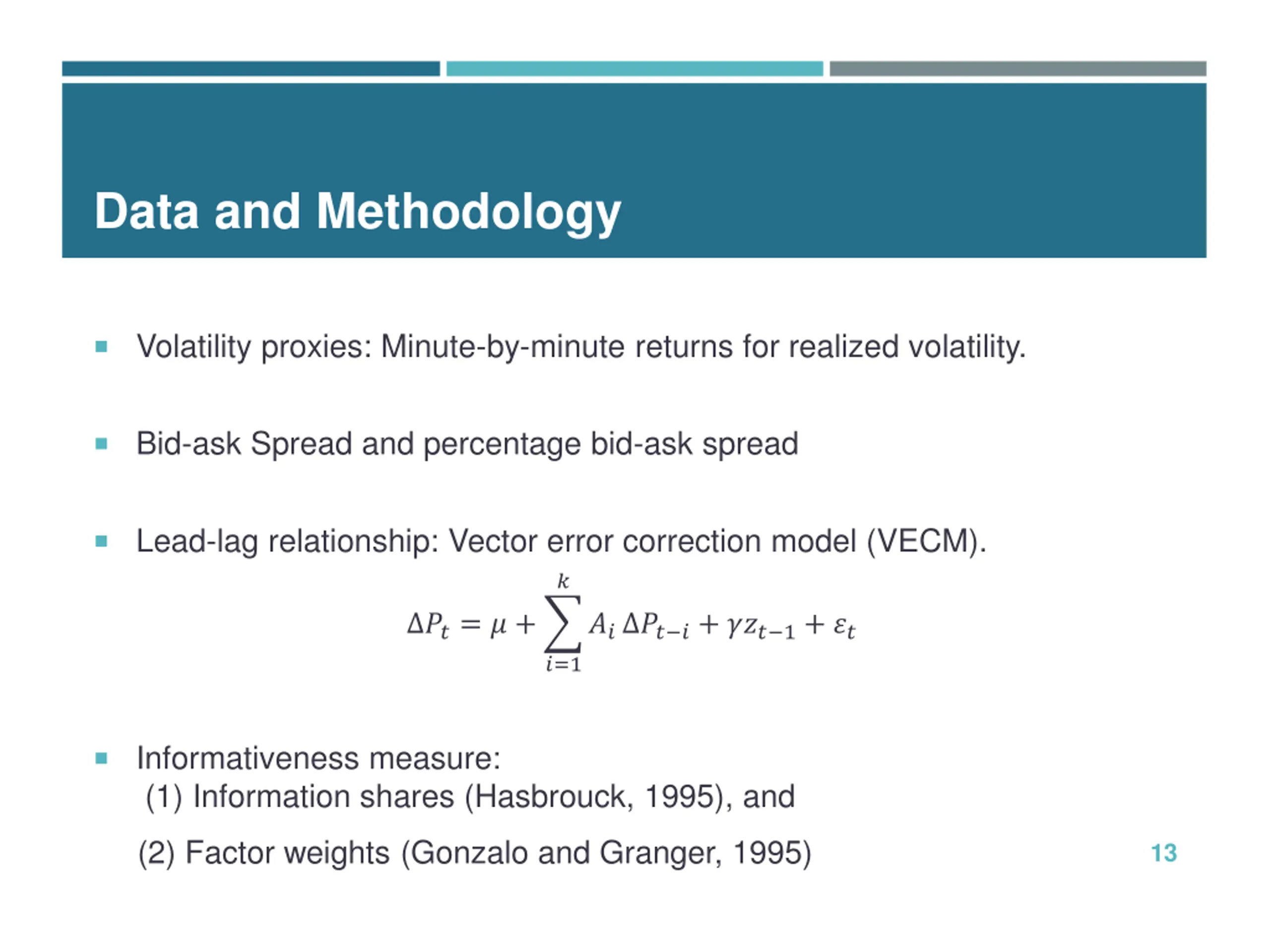 Data and Methodology Volatility proxies: Minute-by-minute returns for realized volatility. Bid-ask Spread and percentage bid-ask spread Lead-lag relationship: Vector error correction model (VECM). ? ??= ? + ?? ?? ?+ ??? 1+ ?? ?=1 Informativeness measure: (1) Information shares (Hasbrouck, 1995), and (2) Factor weights (Gonzalo and Granger, 1995) 13