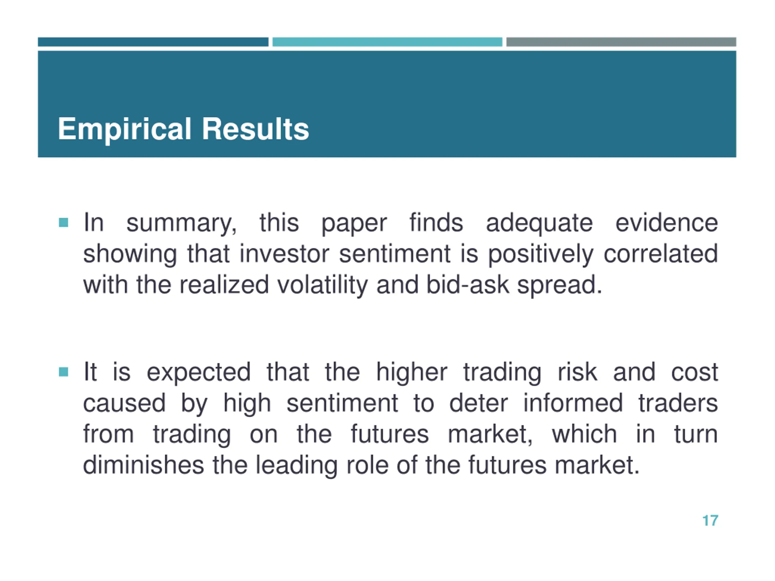 Empirical Results In summary, this paper finds adequate evidence showing that investor sentiment is positively correlated with the realized volatility and bid-ask spread. It is expected that the higher trading risk and cost caused by high sentiment to deter informed traders from trading on the futures market, which in turn diminishes the leading role of the futures market. 17
