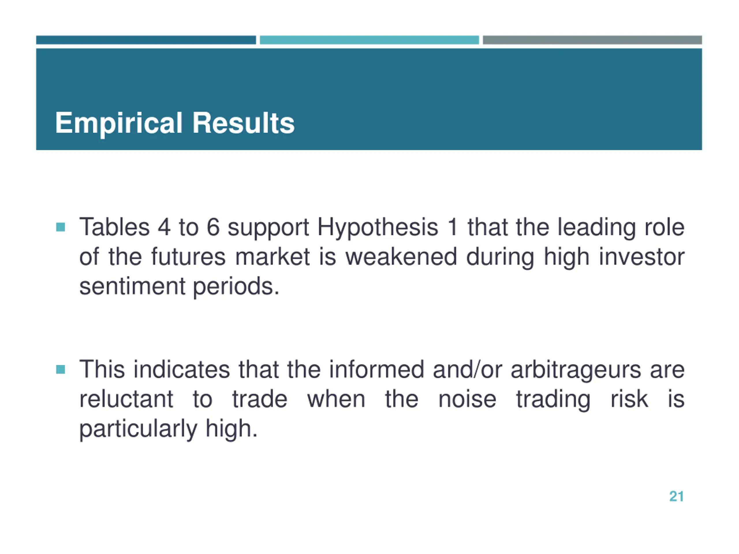 Empirical Results Tables 4 to 6 support Hypothesis 1 that the leading role of the futures market is weakened during high investor sentiment periods. This indicates that the informed and/or arbitrageurs are reluctant to trade when the noise trading risk is particularly high. 21