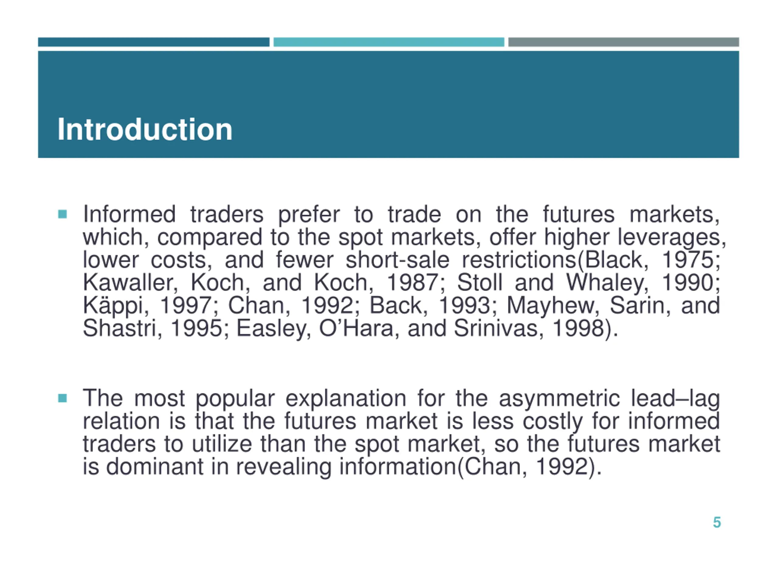 Introduction Informed traders prefer to trade on the futures markets, which, compared to the spot markets, offer higher leverages, lower costs, and fewer short-sale restrictions(Black, 1975; Kawaller, Koch, and Koch, 1987; Stoll and Whaley, 1990; K ppi, 1997; Chan, 1992; Back, 1993; Mayhew, Sarin, and Shastri, 1995; Easley, O Hara, and Srinivas, 1998). The most popular explanation for the asymmetric lead lag relation is that the futures market is less costly for informed traders to utilize than the spot market, so the futures market is dominant in revealing information(Chan, 1992). 5