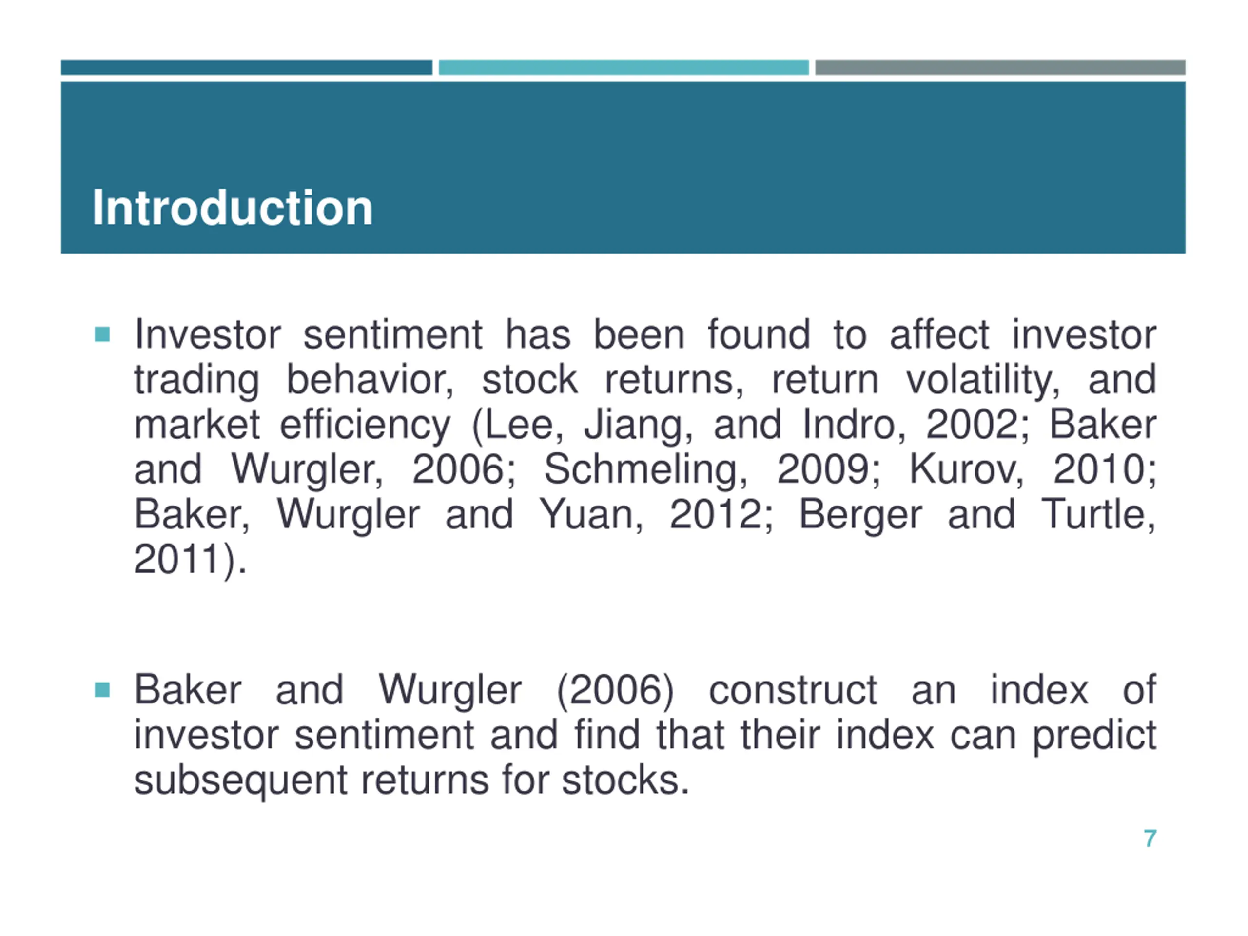 Introduction Investor sentiment has been found to affect investor trading behavior, stock returns, return volatility, and market efficiency (Lee, Jiang, and Indro, 2002; Baker and Wurgler, 2006; Schmeling, 2009; Kurov, 2010; Baker, Wurgler and Yuan, 2012; Berger and Turtle, 2011). Baker and Wurgler (2006) construct an index of investor sentiment and find that their index can predict subsequent returns for stocks. 7