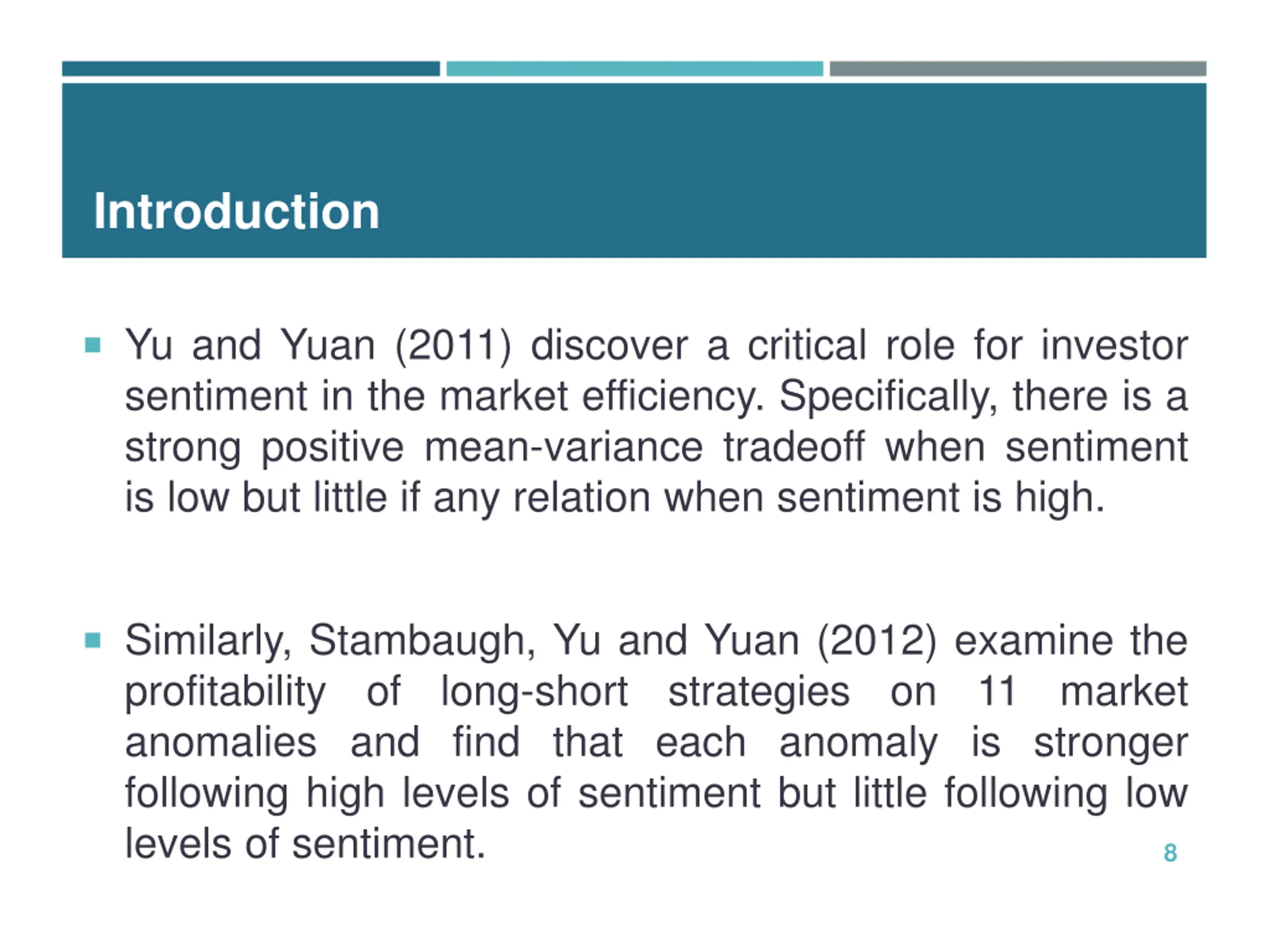 Introduction Yu and Yuan (2011) discover a critical role for investor sentiment in the market efficiency. Specifically, there is a strong positive mean-variance tradeoff when sentiment is low but little if any relation when sentiment is high. Similarly, Stambaugh, Yu and Yuan (2012) examine the profitability of long-short anomalies and find that each anomaly is stronger following high levels of sentiment but little following low levels of sentiment. strategies on 11 market 8