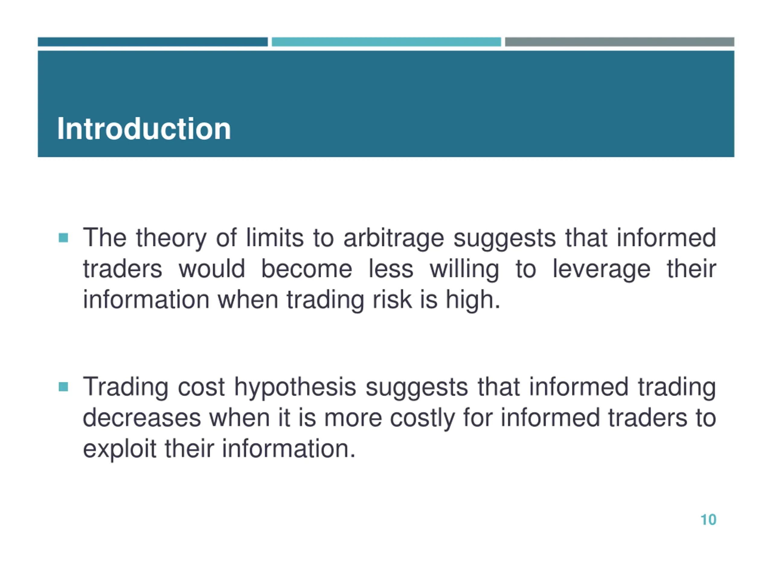 Introduction The theory of limits to arbitrage suggests that informed traders would become less willing to leverage their information when trading risk is high. Trading cost hypothesis suggests that informed trading decreases when it is more costly for informed traders to exploit their information. 10