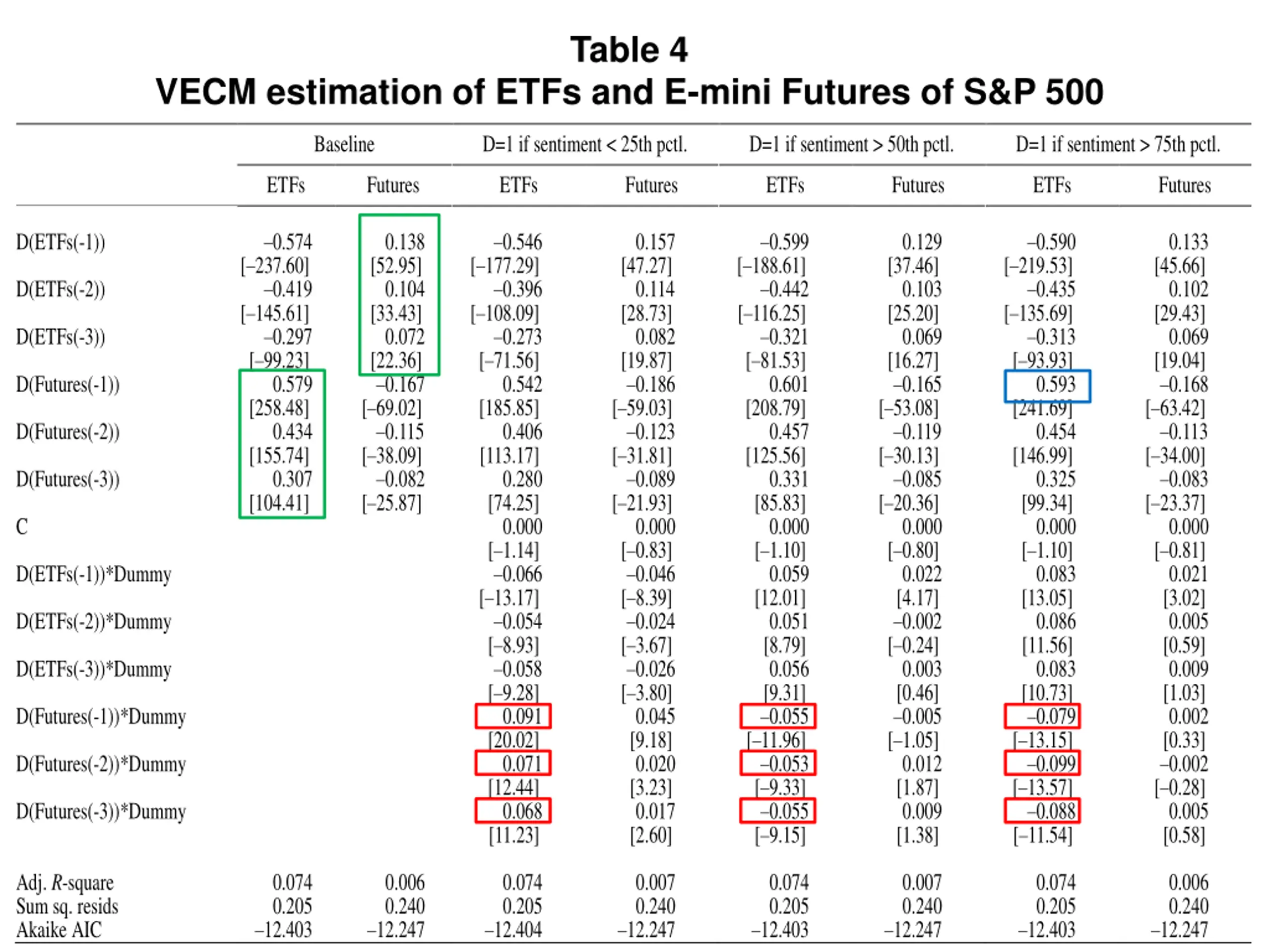 Table 4 VECM estimation of ETFs and E-mini Futures of S&P 500 Baseline D=1 if sentiment < 25th pctl. D=1 if sentiment > 50th pctl. D=1 if sentiment > 75th pctl. D(ETFs(-1)) D(ETFs(-2)) D(ETFs(-3)) D(Futures(-1)) D(Futures(-2)) D(Futures(-3)) C D(ETFs(-1))*Dummy D(ETFs(-2))*Dummy D(ETFs(-3))*Dummy D(Futures(-1))*Dummy D(Futures(-2))*Dummy D(Futures(-3))*Dummy Adj. R-square Sum sq. resids Akaike AIC ETFs 0.574 [ 237.60] 0.419 [ 145.61] 0.297 [ 99.23] 0.579 [258.48] 0.434 [155.74] 0.307 [104.41] Futures 0.138 [52.95] 0.104 [33.43] 0.072 [22.36] 0.167 [ 69.02] 0.115 [ 38.09] 0.082 [ 25.87] 0.006 0.240 12.247 [ 177.29] 0.396 [ 108.09] 0.273 [ 71.56] [185.85] [113.17] [74.25] [ 1.14] 0.066 [ 13.17] 0.054 [ 8.93] 0.058 [ 9.28] [20.02] [12.44] [11.23] 12.404 ETFs 0.546 Futures 0.157 [47.27] 0.114 [28.73] 0.082 [19.87] 0.186 [ 59.03] 0.123 [ 31.81] 0.089 [ 21.93] 0.000 [ 0.83] 0.046 [ 8.39] 0.024 [ 3.67] 0.026 [ 3.80] 0.045 [9.18] 0.020 [3.23] 0.017 [2.60] 0.007 0.240 12.247 [ 188.61] 0.442 [ 116.25] 0.321 [ 81.53] [208.79] [125.56] [85.83] [ 1.10] [12.01] [8.79] [9.31] 0.055 [ 11.96] 0.053 [ 9.33] 0.055 [ 9.15] 12.403 ETFs 0.599 Futures 0.129 [37.46] 0.103 [25.20] 0.069 [16.27] 0.165 [ 53.08] 0.119 [ 30.13] 0.085 [ 20.36] 0.000 [ 0.80] 0.022 [4.17] 0.002 [ 0.24] 0.003 [0.46] 0.005 [ 1.05] 0.012 [1.87] 0.009 [1.38] 0.007 0.240 12.247 [ 219.53] 0.435 [ 135.69] 0.313 [ 93.93] [241.69] [146.99] [99.34] [ 1.10] [13.05] [11.56] [10.73] 0.079 [ 13.15] 0.099 [ 13.57] 0.088 [ 11.54] 12.403 ETFs 0.590 Futures 0.133 [45.66] 0.102 [29.43] 0.069 [19.04] 0.168 [ 63.42] 0.113 [ 34.00] 0.083 [ 23.37] 0.000 [ 0.81] 0.021 [3.02] 0.005 [0.59] 0.009 [1.03] 0.002 [0.33] 0.002 [ 0.28] 0.005 [0.58] 0.006 0.240 12.247 0.542 0.601 0.593 0.406 0.457 0.454 0.280 0.331 0.325 0.000 0.000 0.000 0.059 0.083 0.051 0.086 0.056 0.083 0.091 0.071 0.068 0.074 0.205 12.403 0.074 0.205 0.074 0.205 0.074 0.205