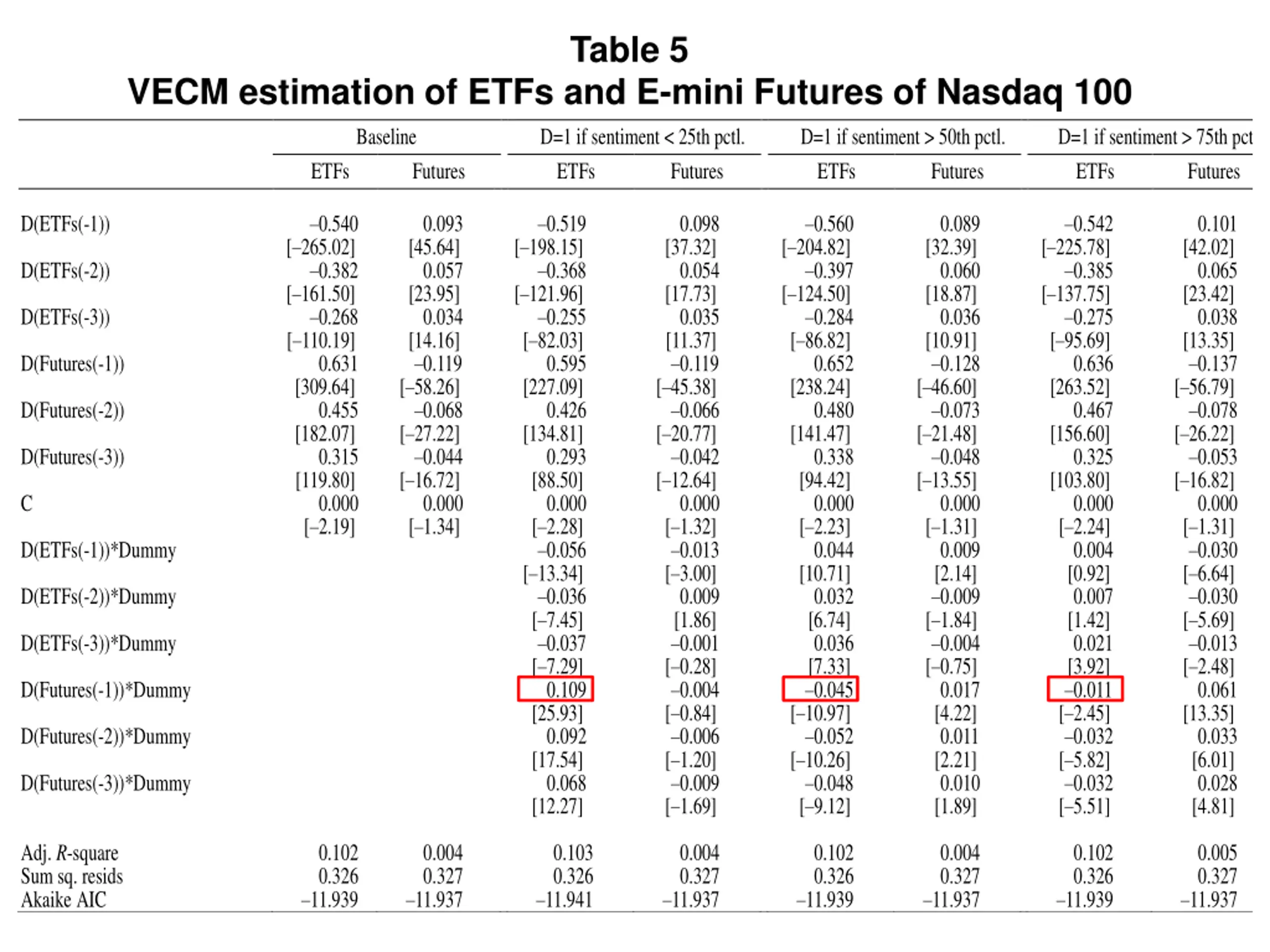 Table 5 VECM estimation of ETFs and E-mini Futures of Nasdaq 100 D(ETFs(-1)) D(ETFs(-2)) D(ETFs(-3)) D(Futures(-1)) D(Futures(-2)) D(Futures(-3)) C D(ETFs(-1))*Dummy D(ETFs(-2))*Dummy D(ETFs(-3))*Dummy D(Futures(-1))*Dummy D(Futures(-2))*Dummy D(Futures(-3))*Dummy Adj. R-square Sum sq. resids Akaike AIC Baseline D=1 if sentiment < 25th pctl. ETFs 0.519 [ 198.15] 0.368 [ 121.96] 0.255 [ 82.03] 0.595 [227.09] 0.426 [134.81] 0.293 [88.50] 0.000 [ 2.28] 0.056 [ 13.34] 0.036 [ 7.45] 0.037 [ 7.29] 0.109 [25.93] 0.092 [17.54] 0.068 [12.27] 0.103 0.326 11.941 D=1 if sentiment > 50th pctl. ETFs 0.560 [ 204.82] 0.397 [ 124.50] 0.284 [ 86.82] 0.652 [238.24] 0.480 [141.47] 0.338 [94.42] 0.000 [ 2.23] 0.044 [10.71] 0.032 [6.74] 0.036 [7.33] 0.045 [ 10.97] 0.052 [ 10.26] 0.048 [ 9.12] 0.102 0.326 11.939 D=1 if sentiment > 75th pctl. ETFs 0.542 [ 225.78] 0.385 [ 137.75] 0.275 [ 95.69] 0.636 [263.52] 0.467 [156.60] 0.325 [103.80] 0.000 [ 2.24] 0.004 [0.92] 0.007 [1.42] 0.021 [3.92] 0.011 [ 2.45] 0.032 [ 5.82] 0.032 [ 5.51] 0.102 0.326 11.939 ETFs 0.540 [ 265.02] 0.382 [ 161.50] 0.268 [ 110.19] 0.631 [309.64] 0.455 [182.07] 0.315 [119.80] 0.000 [ 2.19] Futures 0.093 [45.64] 0.057 [23.95] 0.034 [14.16] 0.119 [ 58.26] 0.068 [ 27.22] 0.044 [ 16.72] 0.000 [ 1.34] 0.004 0.327 11.937 Futures 0.098 [37.32] 0.054 [17.73] 0.035 [11.37] 0.119 [ 45.38] 0.066 [ 20.77] 0.042 [ 12.64] 0.000 [ 1.32] 0.013 [ 3.00] 0.009 [1.86] 0.001 [ 0.28] 0.004 [ 0.84] 0.006 [ 1.20] 0.009 [ 1.69] 0.004 0.327 11.937 Futures 0.089 [32.39] 0.060 [18.87] 0.036 [10.91] 0.128 [ 46.60] 0.073 [ 21.48] 0.048 [ 13.55] 0.000 [ 1.31] 0.009 [2.14] 0.009 [ 1.84] 0.004 [ 0.75] 0.017 [4.22] 0.011 [2.21] 0.010 [1.89] 0.004 0.327 11.937 Futures 0.101 [42.02] 0.065 [23.42] 0.038 [13.35] 0.137 [ 56.79] 0.078 [ 26.22] 0.053 [ 16.82] 0.000 [ 1.31] 0.030 [ 6.64] 0.030 [ 5.69] 0.013 [ 2.48] 0.061 [13.35] 0.033 [6.01] 0.028 [4.81] 0.005 0.327 11.937 0.102 0.326 11.939